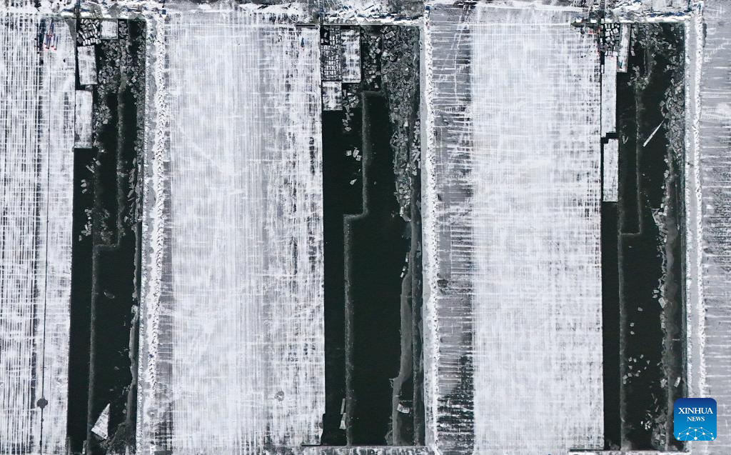 An aerial drone photo shows an ice collection area at the Harbin section of Songhua River in Harbin, northeast China's Heilongjiang Province, Dec. 9, 2025.