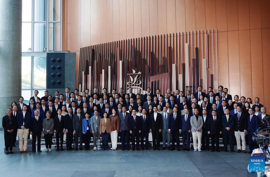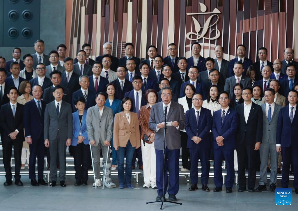 Andrew Leung Kwan-yuen, president of the seventh-term Legislative Council (LegCo) of the Hong Kong Special Administrative Region (HKSAR), incumbent LegCo members and members-elect of the eighth-term LegCo attend a press briefing in Hong Kong, south China, Dec. 9, 2025. (Photo by Wang Shen/Xinhua)