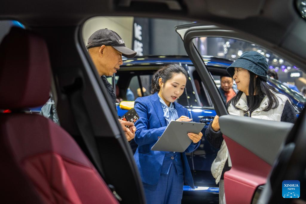 A visitor (1st R) learns about a car on display at the 21st Changsha International Automobile Expo in Changsha, central China's Hunan Province, on Dec. 10, 2025. The 6-day expo kicked off on Wednesday at the Changsha International Convention and Exhibition Center, showcasing some 1,000 vehicles from over 70 automobile brands. (Xinhua/Chen Sihan)