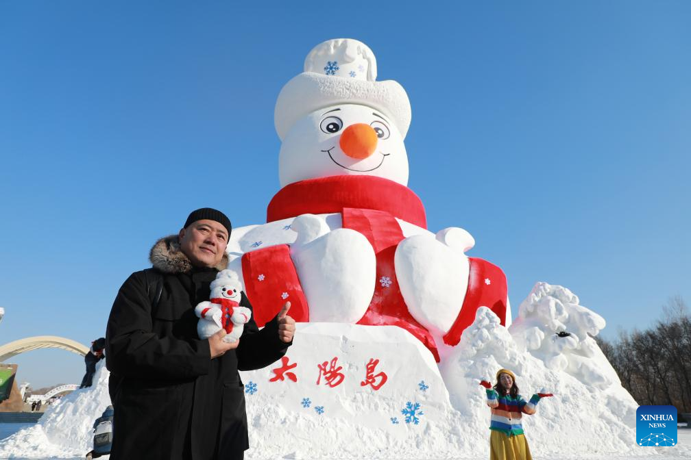 Tourists pose for photos in front of "Mr. Snowman" at the Sun Island scenic spot in Harbin, northeast China's Heilongjiang Province, Dec. 9, 2025. "Mr. Snowman," an iconic snow sculpture landscape of the 38th Sun Island International Snow Sculpture Art Expo with a height of 23.8 meters and made with 5,000 cubic meters of snow, was officially unveiled at the Sun Island scenic spot on Tuesday. (Photo by Wang Dong/Xinhua)