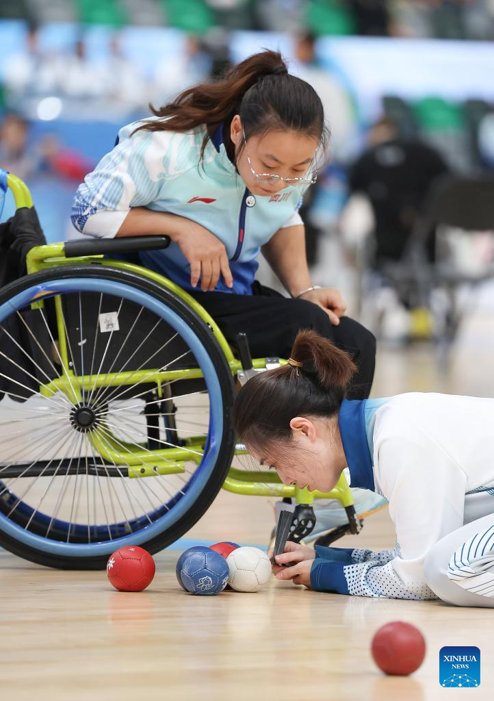 Zhan Xia (R) of Guangdong competes during the women's individual BC4 semifinals of boccia at China's 12th National Games for Persons with Disabilities and the 9th National Special Olympic Games in Hong Kong, south China, Dec. 11, 2025. (Xinhua/Lu Hanxin)