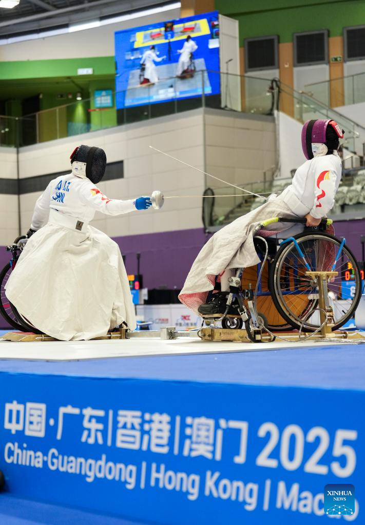 Tan Shumei (R) of Shanghai competes against Ao Lanzhu of Shanghai during the women's epee individual category B final of wheelchair fencing at China's 12th National Games for Persons with Disabilities and the 9th National Special Olympic Games in Hong Kong, south China, Dec. 11, 2025. (Xinhua/Hou Jun)