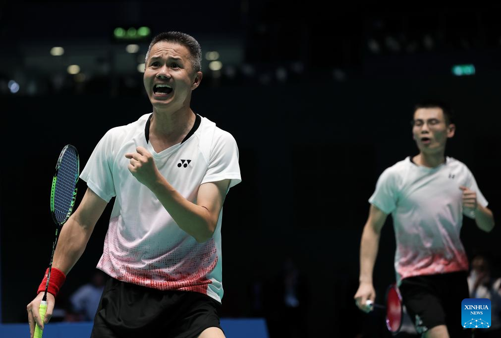 (251211) -- MACAO, Dec. 11, 2025 (Xinhua) -- Zeng Qingtao (R)/Luo Guangliang of Fujian react during the men's doubles SH6 group 1 match of para badminton at China's 12th National Games for Persons with Disabilities and the 9th National Special Olympic Games in Macao, China, Dec. 11, 2025. (Xinhua/Mao Siqian)