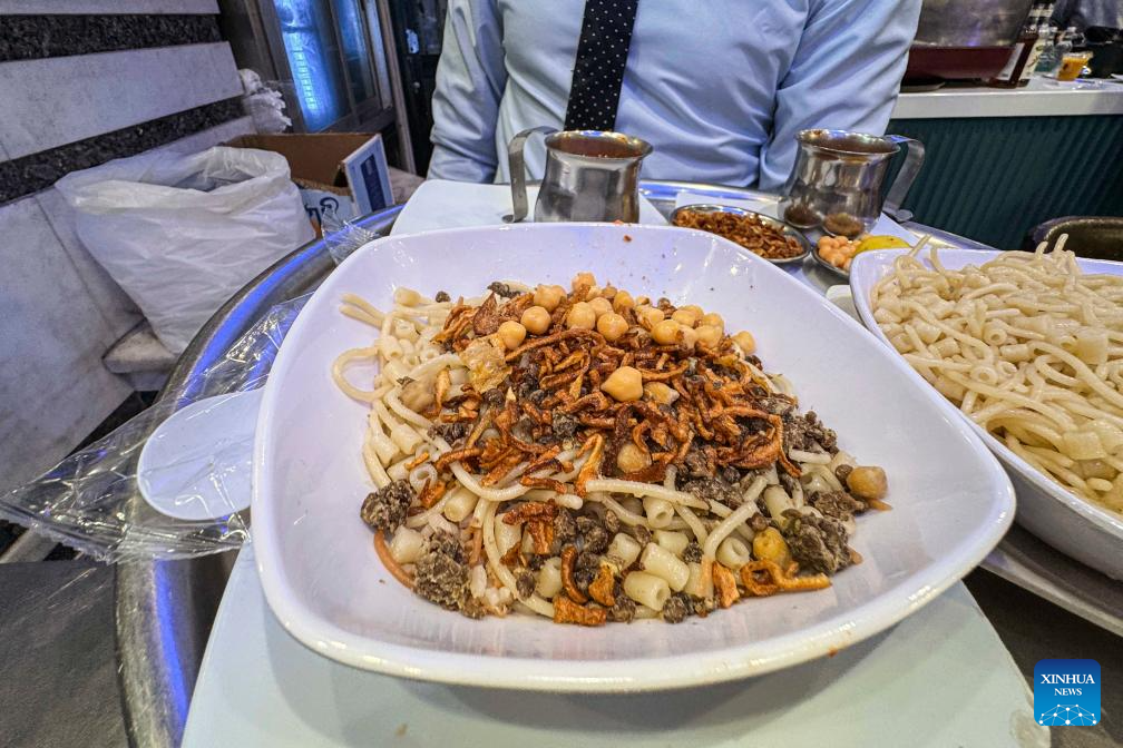 Photo taken on Dec. 10, 2025 shows Koshary at a restaurant in Cairo, Egypt. Egypt's beloved national dish Koshary has been officially inscribed on the United Nations Educational, Scientific and Cultural Organization (UNESCO) Representative List of the Intangible Cultural Heritage of Humanity for 2025, the Egyptian Ministry of Culture said Wednesday in a statement. (Photo by Ahmed Gomaa/Xinhua)