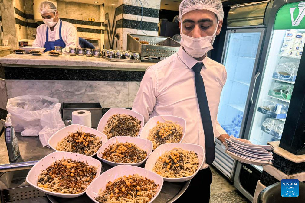 A waiter serves Koshary for customers at a restaurant in Cairo, Egypt, Dec. 10, 2025. Egypt's beloved national dish Koshary has been officially inscribed on the United Nations Educational, Scientific and Cultural Organization (UNESCO) Representative List of the Intangible Cultural Heritage of Humanity for 2025, the Egyptian Ministry of Culture said Wednesday in a statement. (Photo by Ahmed Gomaa/Xinhua)