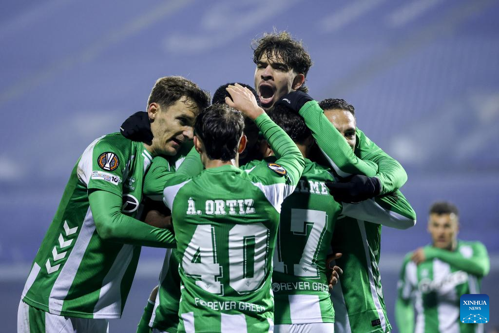 Players of Real Betis celebrate team's third goal during the UEFA Europa League 2025/26 League Phase match between GNK Dinamo and Real Betis in Zagreb, Croatia, on Dec. 11, 2025. (Sanjin Strukic/PIXSELL via Xinhua)