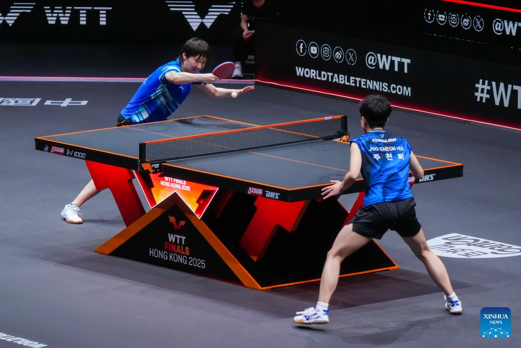 Wang Manyu (L) of China hits a return during the women's singles quarterfinal match against Joo Cheonhui of South Korea at the WTT Finals Hong Kong 2025 in Hong Kong, south China, Dec. 12, 2025. (Xinhua/Zhu Wei)