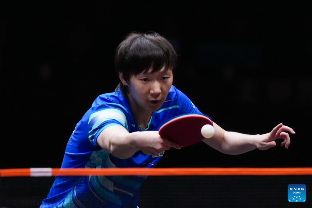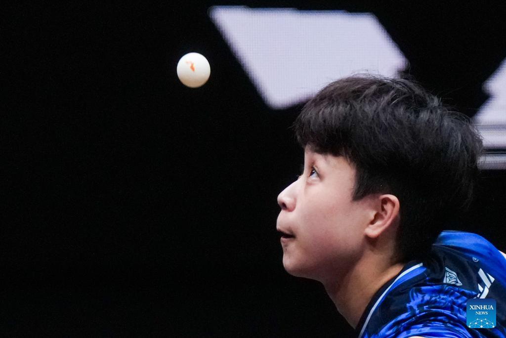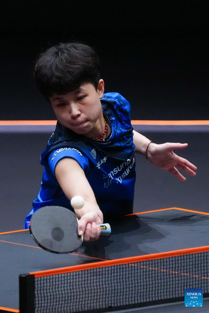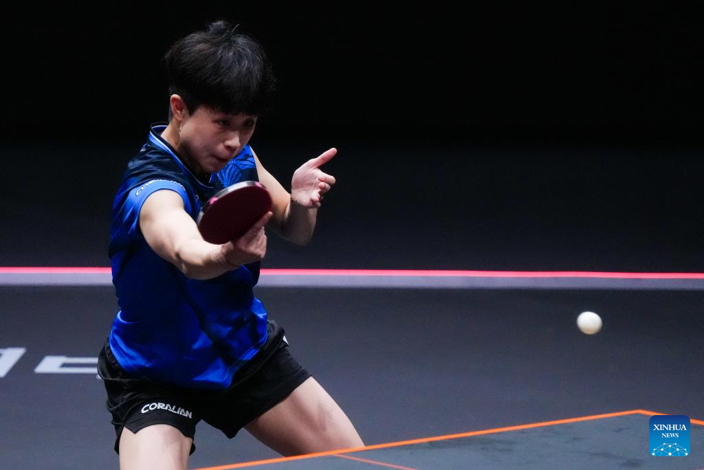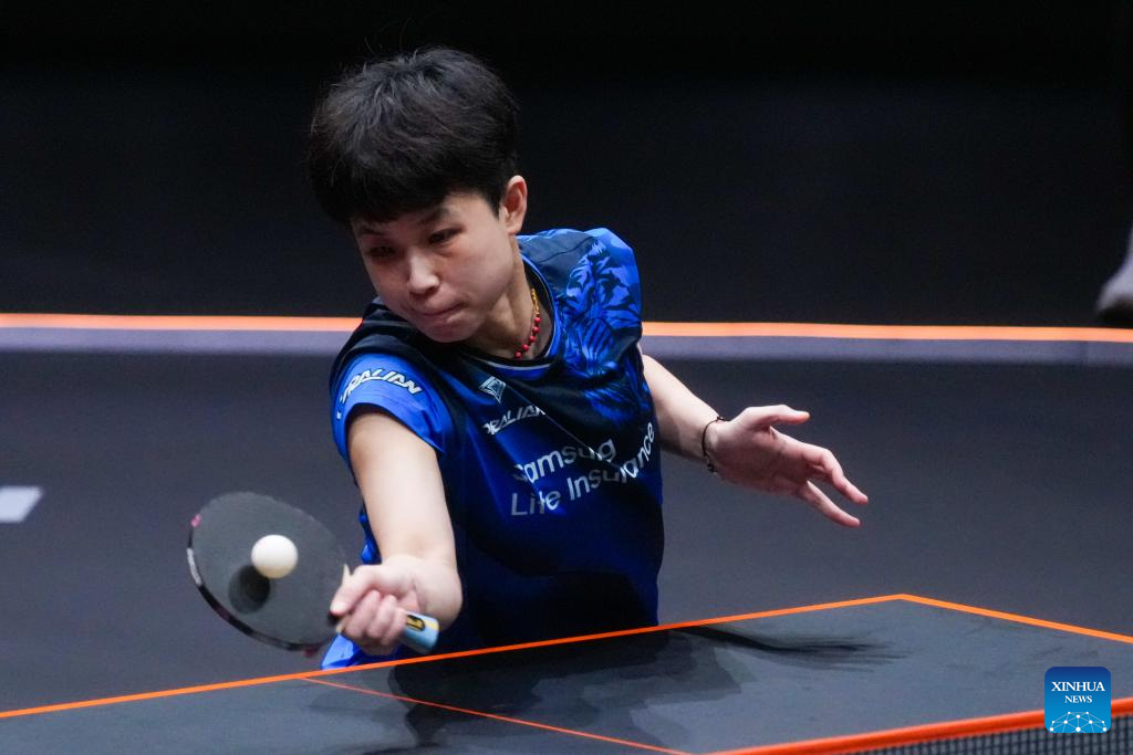 Joo Cheonhui of South Korea hits a return during the women's singles quarterfinal match against Wang Manyu of China at the WTT Finals Hong Kong 2025 in Hong Kong, south China, Dec. 12, 2025. (Xinhua/Chen Duo)