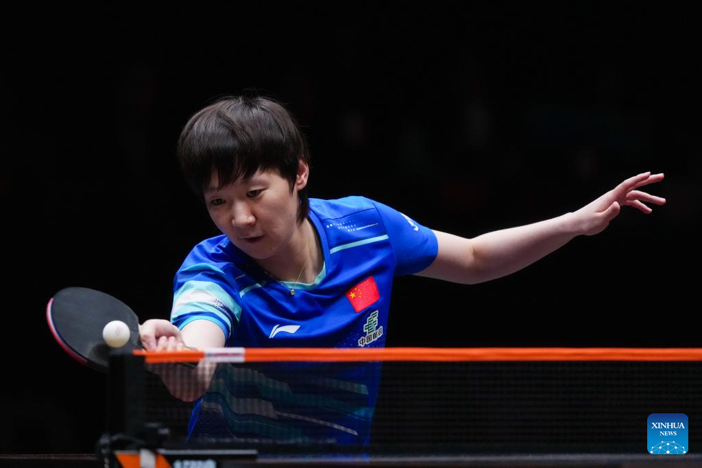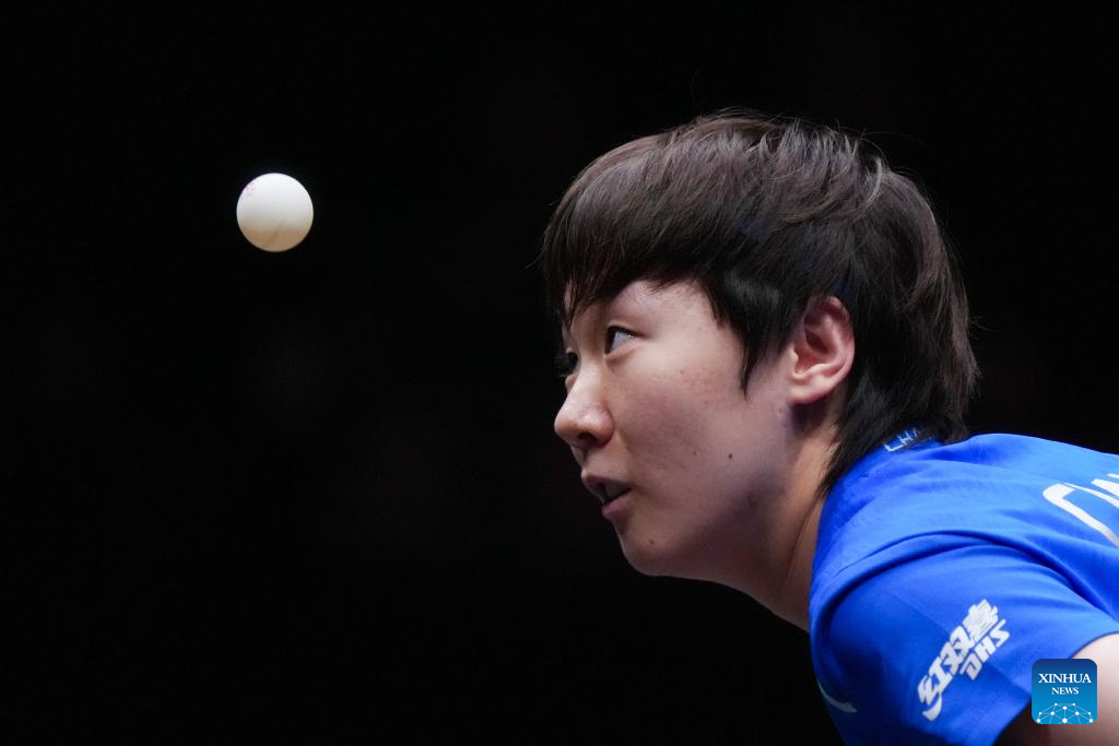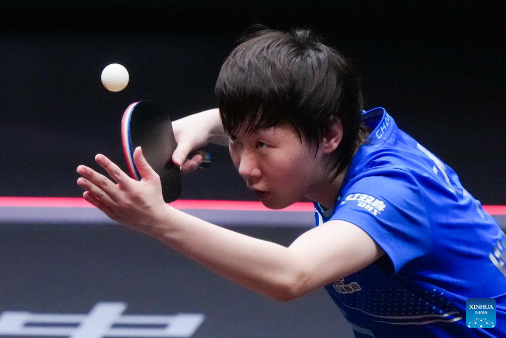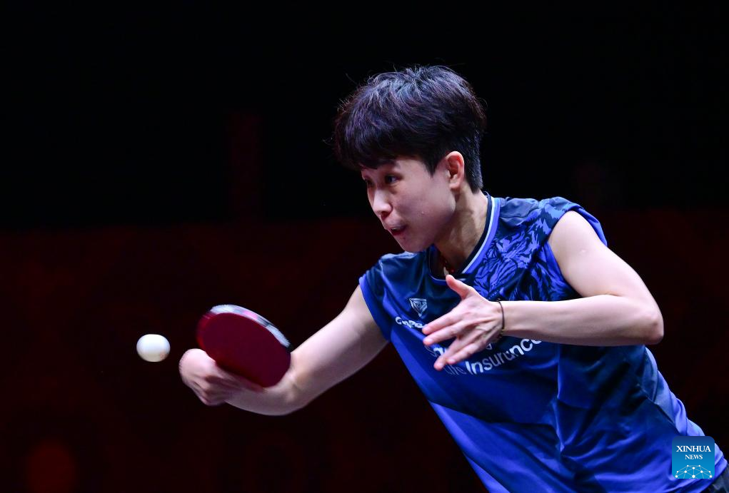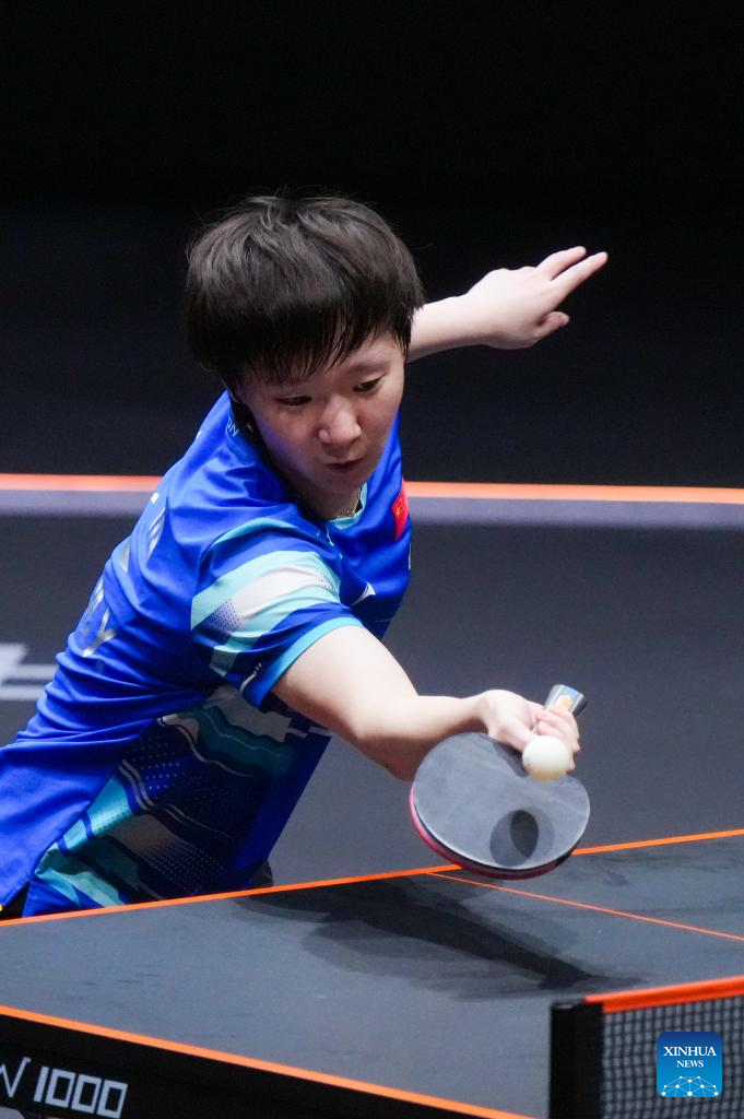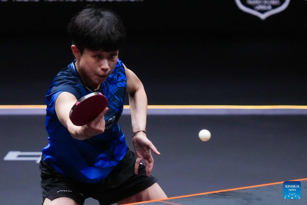 Wang Manyu of China hits a return during the women's singles quarterfinal match against Joo Cheonhui of South Korea at the WTT Finals Hong Kong 2025 in Hong Kong, south China, Dec. 12, 2025. (Xinhua/Zhu Wei)