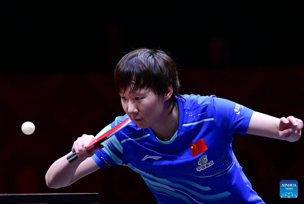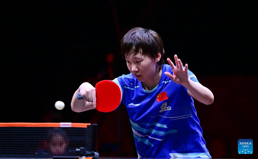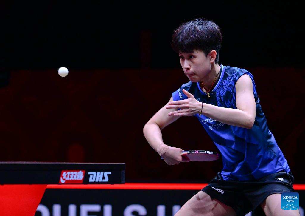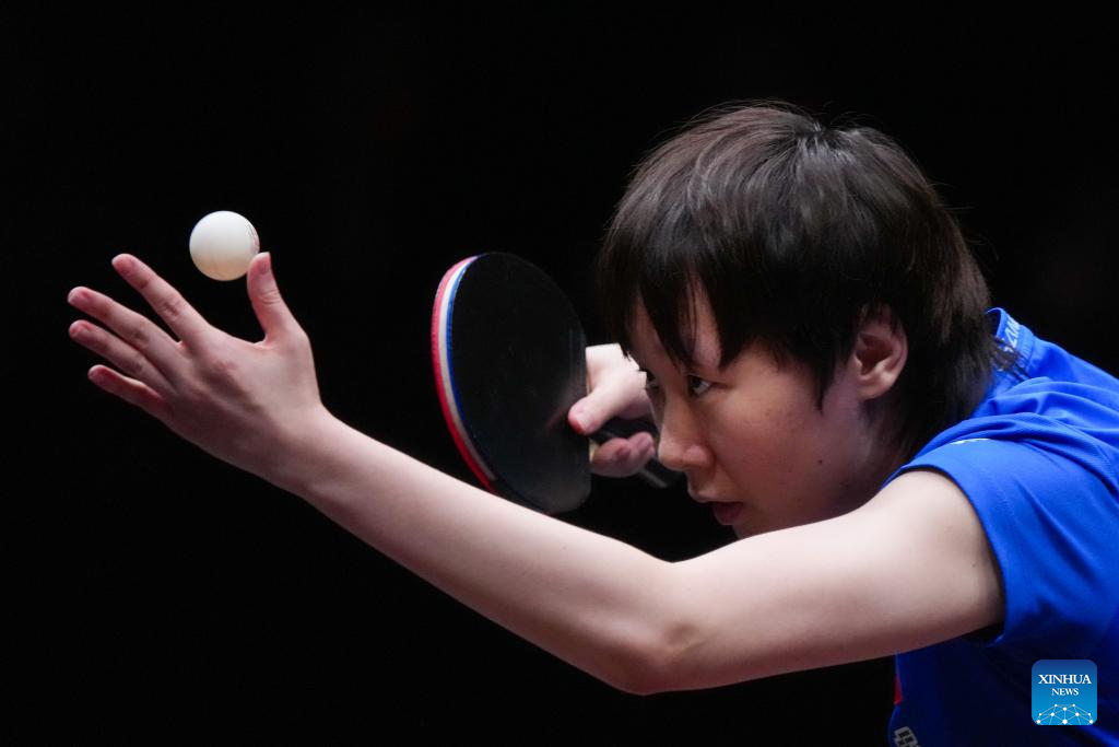 Wang Manyu of China hits a return during the women's singles quarterfinal match against Joo Cheonhui of South Korea at the WTT Finals Hong Kong 2025 in Hong Kong, south China, Dec. 12, 2025. (Xinhua/Chen Duo)