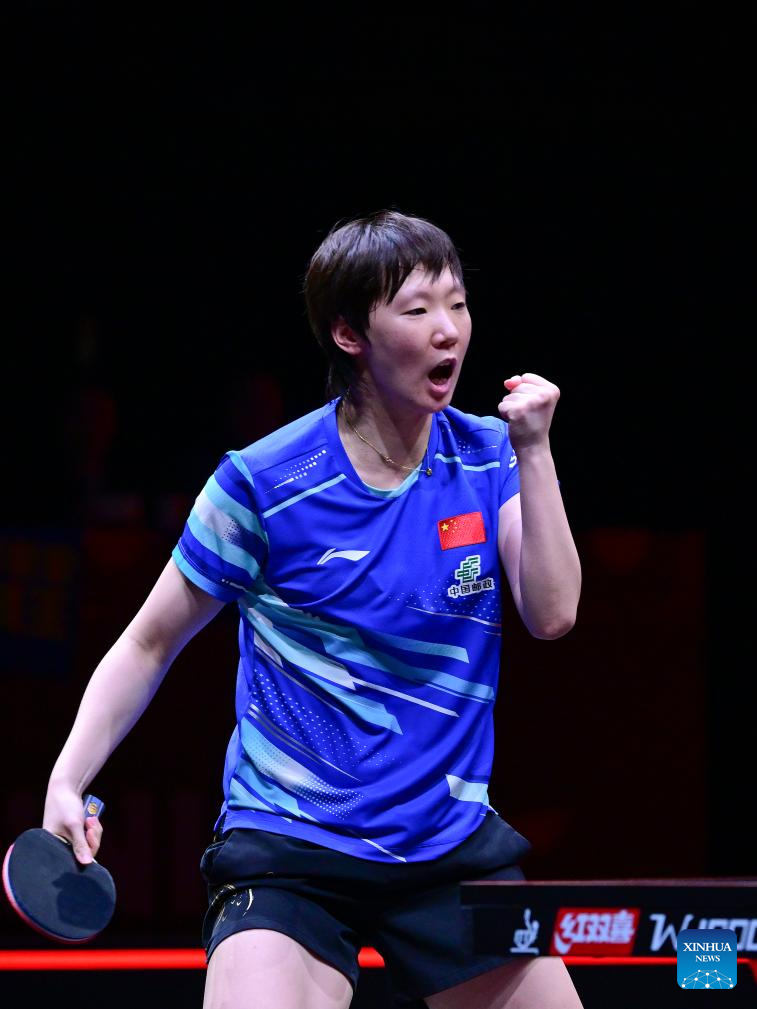 Wang Manyu of China reacts during the women's singles quarterfinal match against Joo Cheonhui of South Korea at the WTT Finals Hong Kong 2025 in Hong Kong, south China, Dec. 12, 2025. (Xinhua/Chen Duo)
