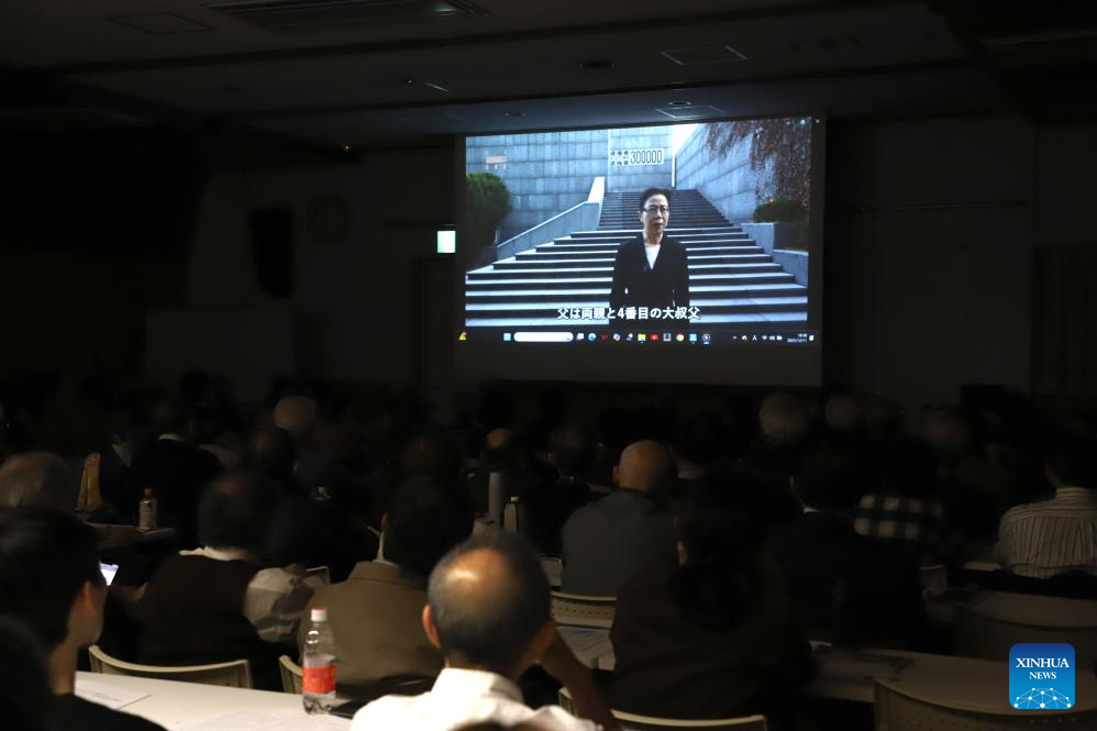 Cao Yuli, daughter of two Nanjing Massacre survivors, speaks in a video testimony during a testimony meeting on the Nanjing Massacre in Tokyo, Japan, Dec. 11, 2025. (Xinhua/Li Ziyue)