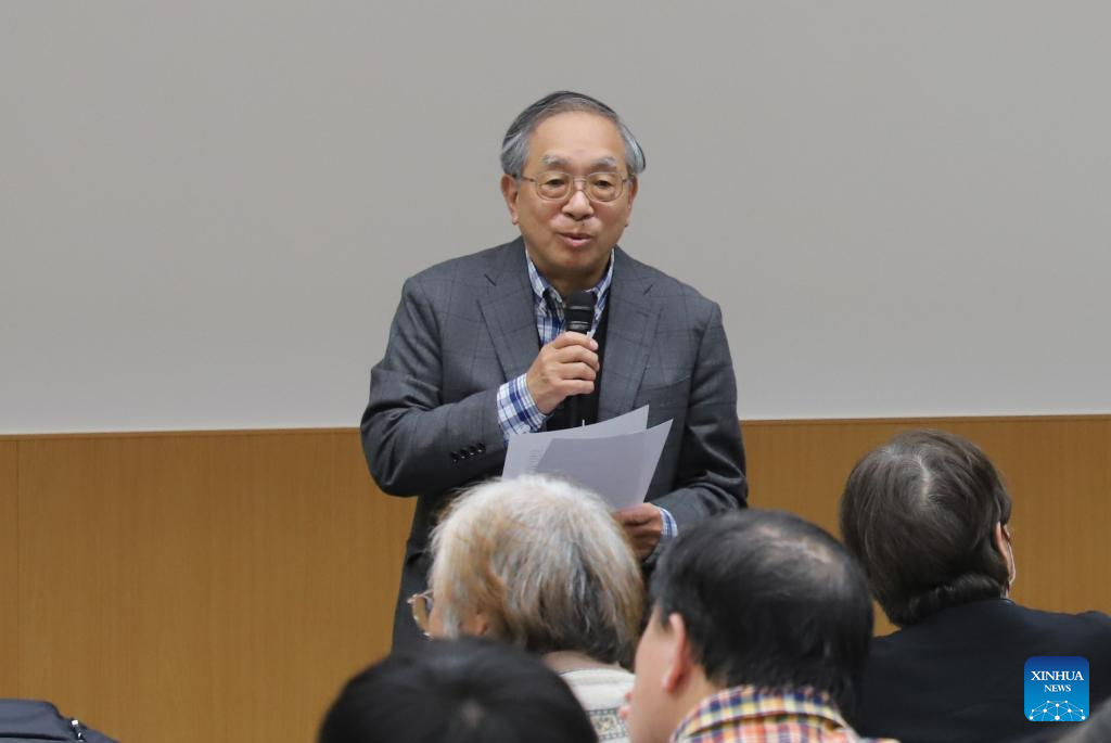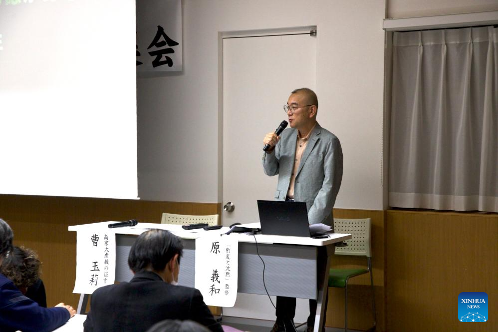 Japanese director Yoshikazu Hara speaks during a testimony meeting on the Nanjing Massacre in Tokyo, Japan, Dec. 11, 2025. (Xinhua/Li Ziyue)