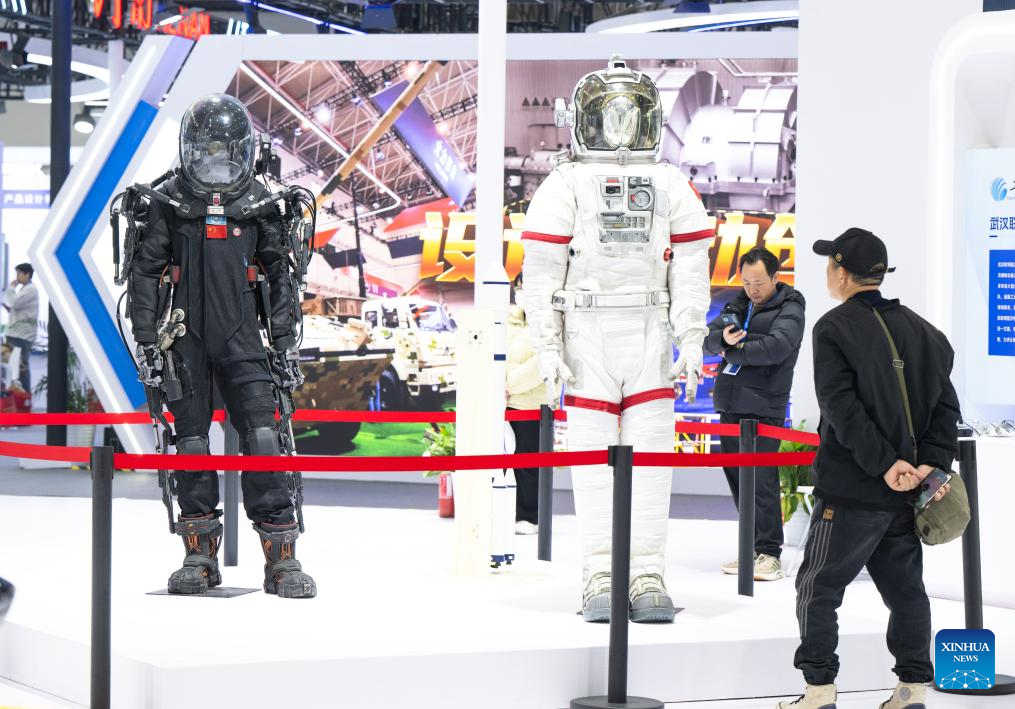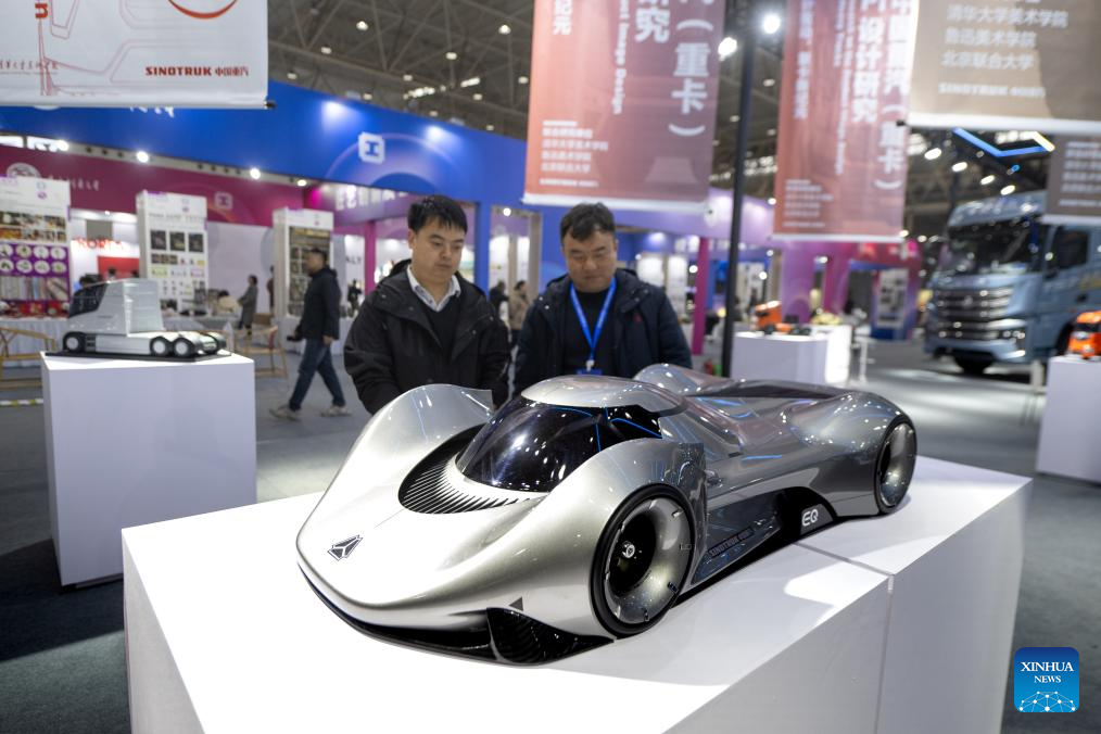 People view an exhibit at the 2025 Wuhan International Industrial Design Expo in Wuhan, central China's Hubei Province, Dec. 12, 2025. The expo kicked off here on Friday, featuring ten specialized exhibition areas including low-altitude economy, AI empowerment, and future industries. More than 100 enterprises participated in the exhibition. (Xinhua/Xiao Yijiu)