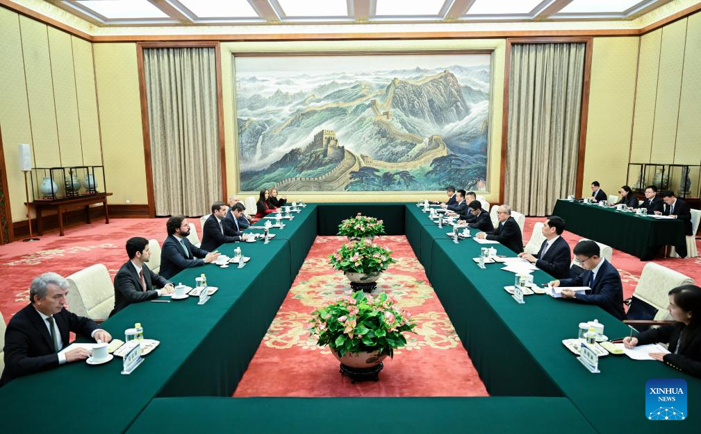 Li Hongzhong, vice chairman of the National People's Congress Standing Committee and a member of the Political Bureau of the Communist Party of China (CPC) Central Committee, meets with a delegation from the Social Democratic Party (PSD) of Portugal led by Hugo Soares, the secretary-general and the parliamentary leader of the party, in Beijing, capital of China, Dec. 12, 2025. (Xinhua/Dai Tianfang)