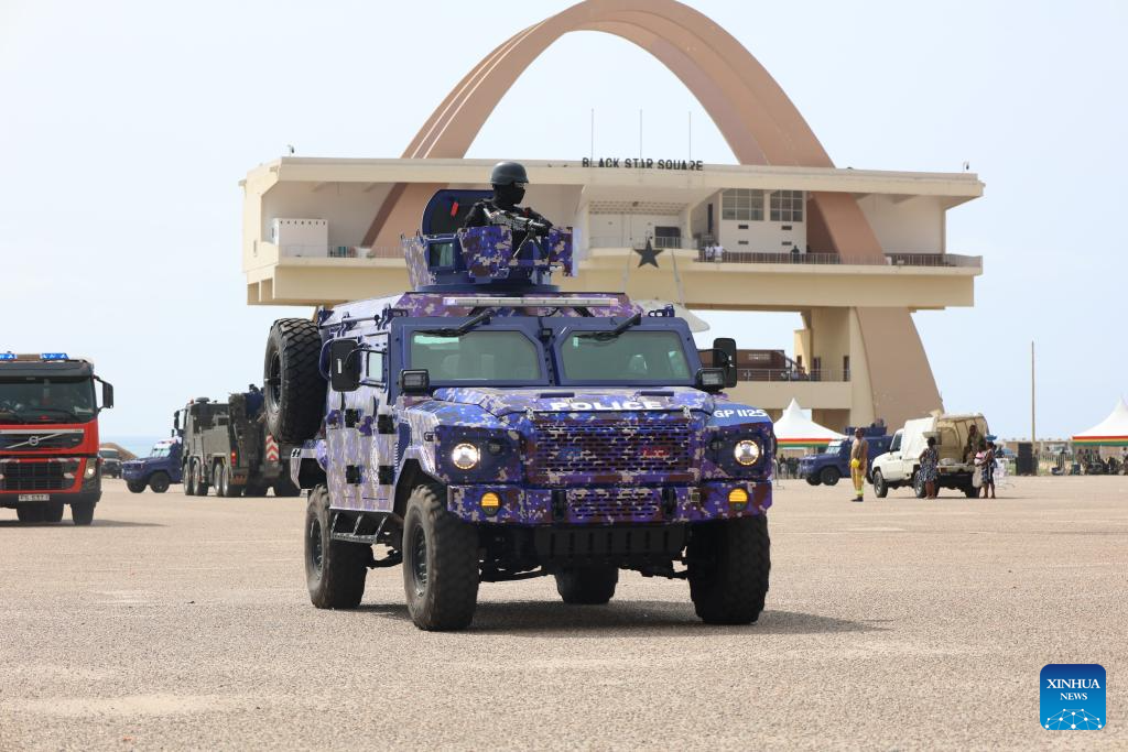 The "Show of Force" operation, involving the military, police, immigration, fire service, prisons, and the customs division of the Ghana Revenue Authority, deployed personnel, combat gear and hardware along major routes from the city of Accra to communities outside the capital to boost inter-agency cooperation and reinforce the country's security posture. (Photo by Seth/Xinhua)