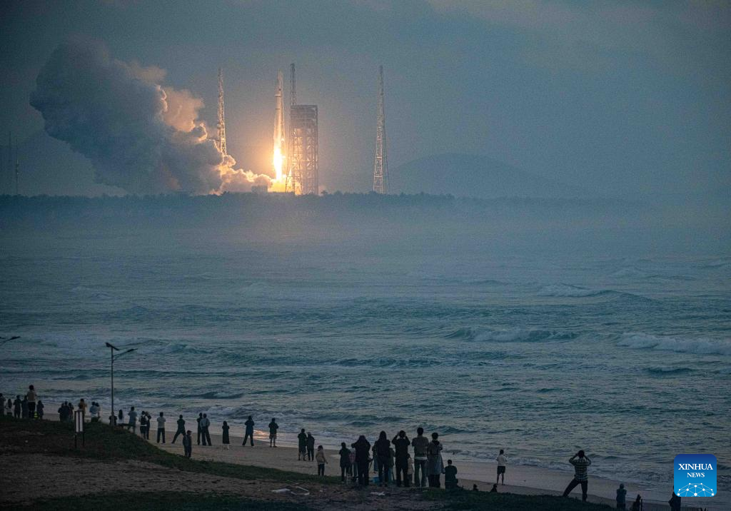 People watch a rocket blasting off from the Hainan commercial spacecraft launch site in Wenchang International Aerospace City, south China's Hainan Province, Dec. 12, 2025. China's Hainan Free Trade Port (FTP) is preparing for island-wide special customs operations, a major milestone in the opening-up drive of the world's second-largest economy despite rising protectionism worldwide.