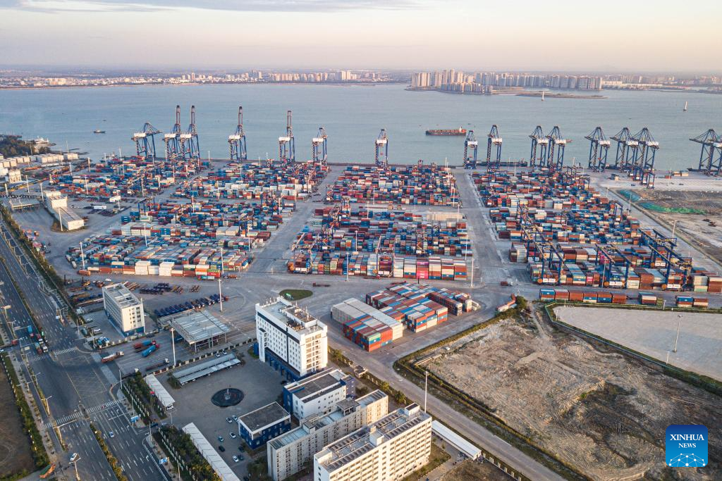 An aerial drone photo taken on Nov. 21, 2025 shows a view of the Yangpu International Container Port in Yangpu Economic Development Zone, south China's Hainan Province. China's Hainan Free Trade Port (FTP) is preparing for island-wide special customs operations, a major milestone in the opening-up drive of the world's second-largest economy despite rising protectionism worldwide.