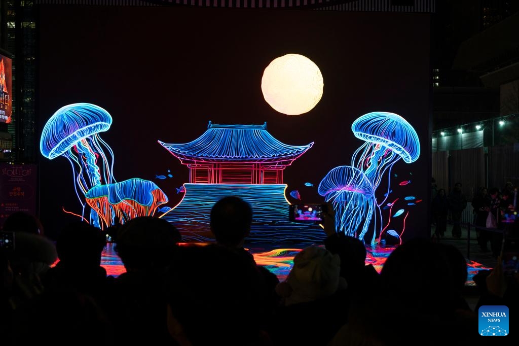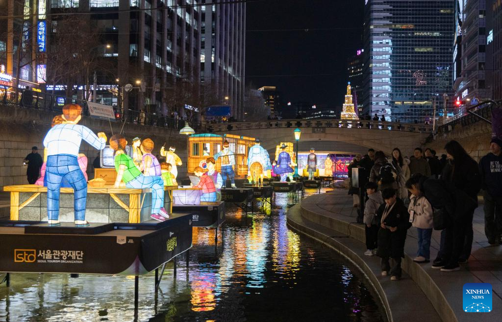 People view light installations of the 2025 Seoul Winter Festa at the Cheonggye stream in Seoul, South Korea, Dec. 12, 2025. (Photo by Jun Hyosang/Xinhua)
