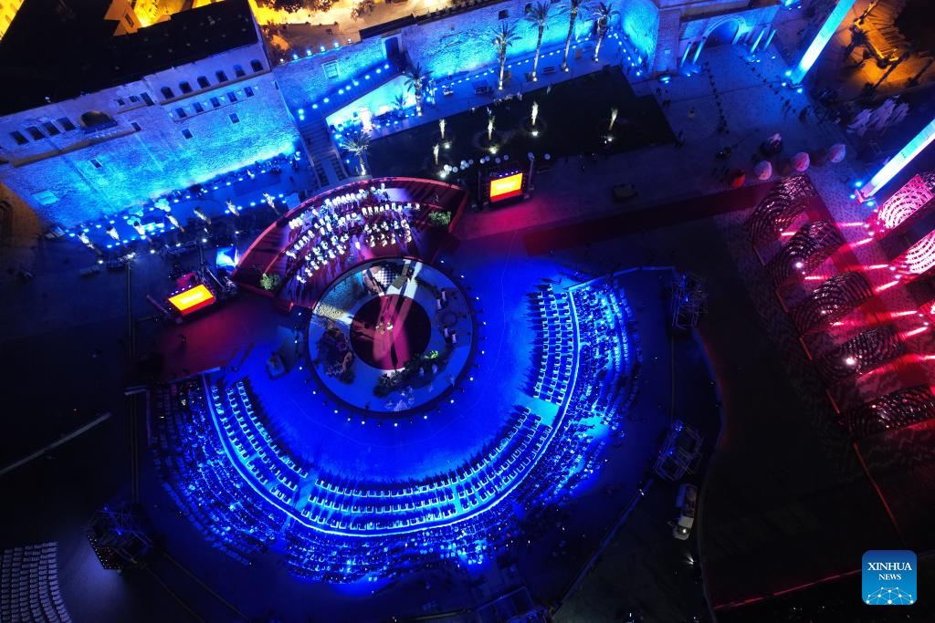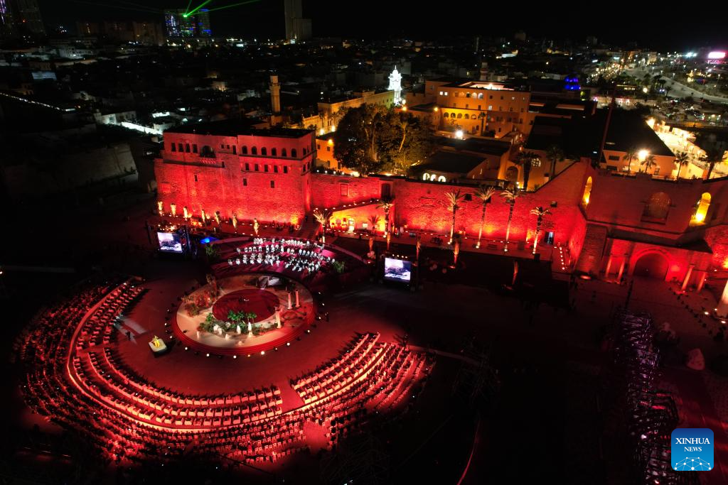 An aerial drone photo shows a performance celebrating the reopening of National Museum in Tripoli, Libya, Dec. 12, 2025. Libya on Friday celebrated the reopening of its national museum, housed within the historic Red Castle complex in Tripoli, marking a significant cultural moment after 14 years of closure following the 2011 popular uprising that toppled the rule of Muammar Gaddafi. (Photo by Hazem Turkia/Xinhua)