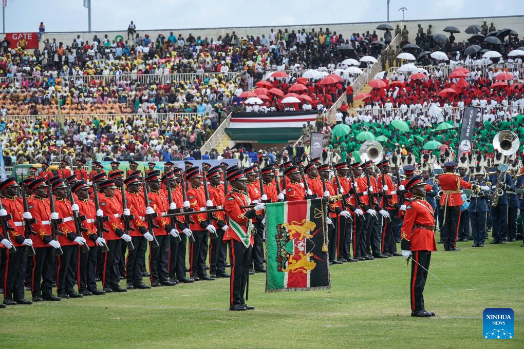 Soldiers attend a parade during a celebration for the 62nd anniversary of Kenya's independence in Nairobi, Kenya, Dec. 12, 2025. A celebration marking the 62nd anniversary of Kenya's independence was held at Nyayo Stadium in Nairobi on Friday.