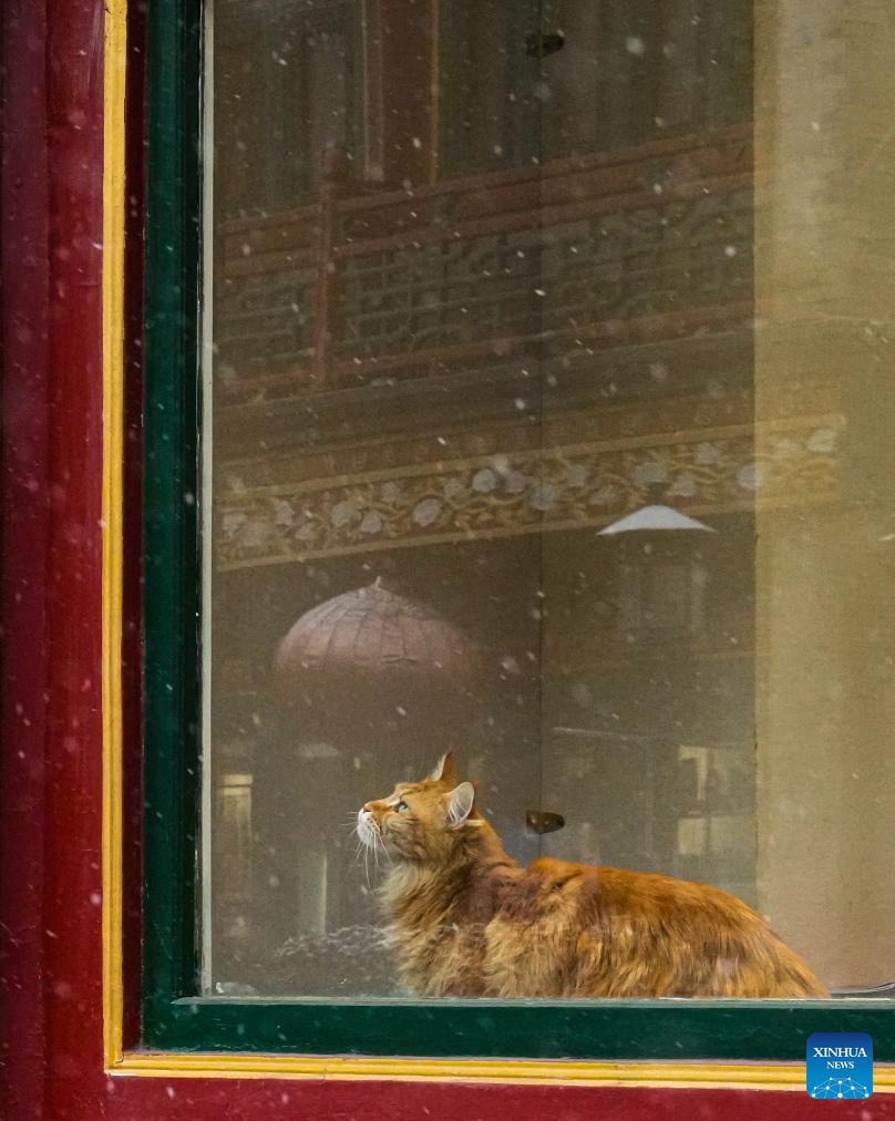 A cat perched on a window sill observes the falling snow outside in Beijing, capital of China, Dec. 12, 2025. Beijing witnessed its first significant snowfall of this winter season on Friday. (Xinhua/Bi Xiaoyang)