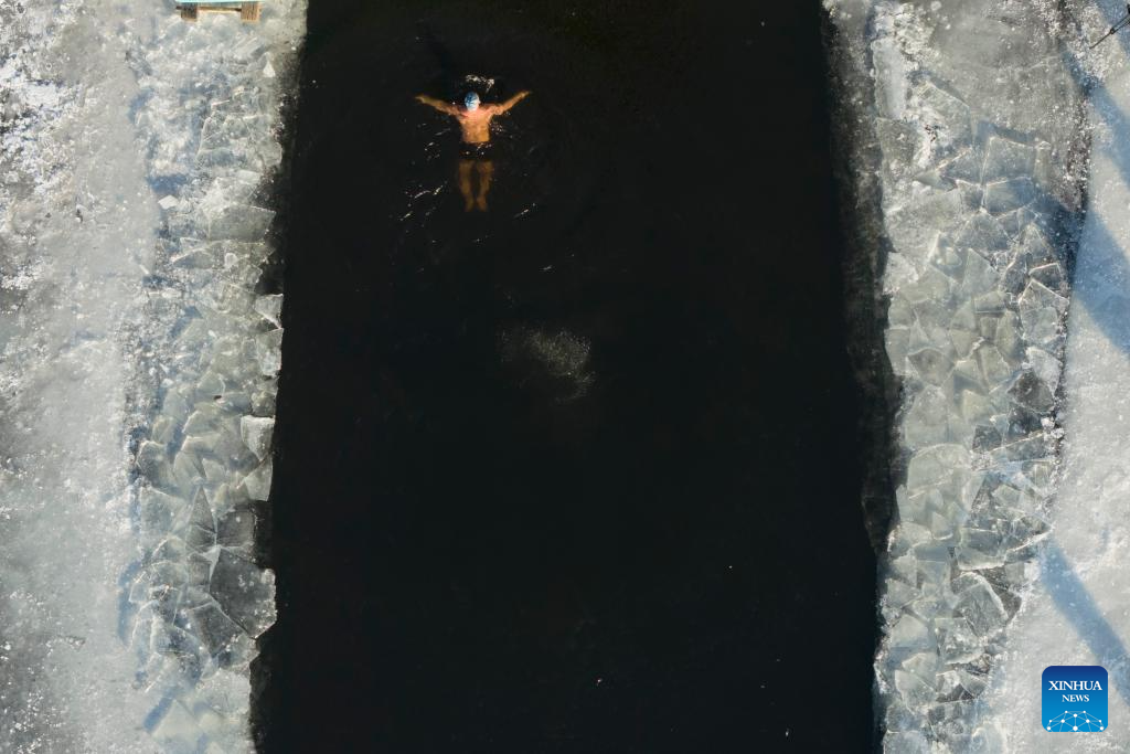 An aerial drone photo taken on Dec. 12, 2025 shows a man swimming in icy water at a park in Harbin, northeast China's Heilongjiang Province. (Xinhua/Zhang Tao)