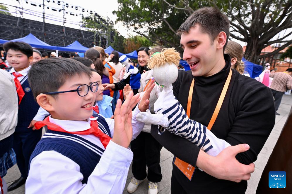A Russian performer attending the Quanzhou International Puppet Festival interacts with a boy in Quanzhou, southeast China's Fujian Province, Dec. 12, 2025. The puppet festival, which is part of the 2025 Maritime Silk Road International Cultural Tourism Festival, kicked off here Friday. Puppeteers home and abroad presented various puppet shows here, delivering a visual feast for the audience. (Xinhua/Jiang Kehong)