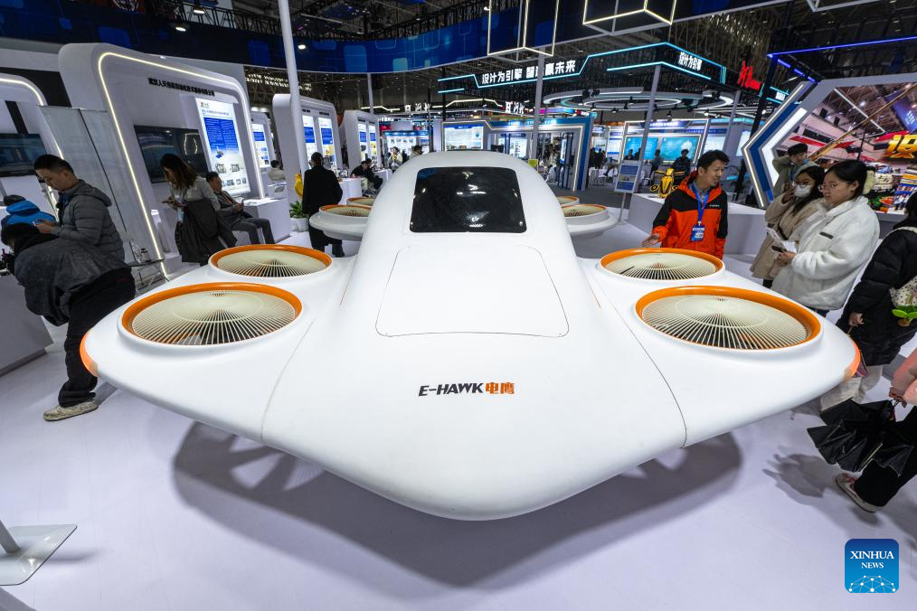 People learn about a ducted-fan drone at the 2025 Wuhan International Industrial Design Expo in Wuhan, central China's Hubei Province, Dec. 12, 2025. The expo kicked off here on Friday, featuring ten specialized exhibition areas including low-altitude economy, AI empowerment, and future industries. More than 100 enterprises participated in the exhibition. (Xinhua/Xiao Yijiu)