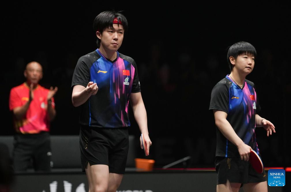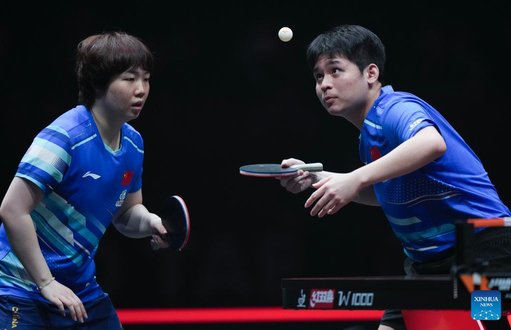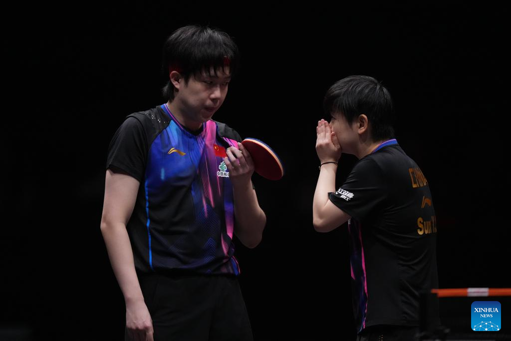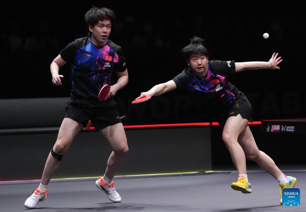 Wang Chuqin/Sun Yingsha (R) of China compete during the mixed doubles quarterfianl match between Wang Chuqin/Sun Yingsha of China and Matsushima Sora/Harimoto Miwa of Japan at the WTT Finals Hong Kong 2025 in Hong Kong, south China, Dec. 13, 2025. (Xinhua/Lui Siu Wai)