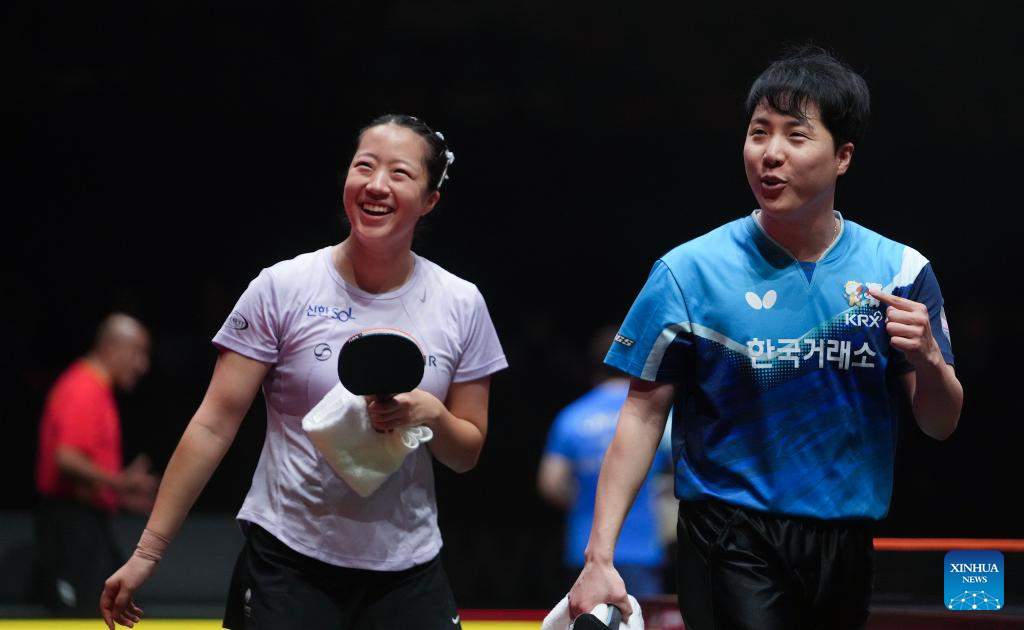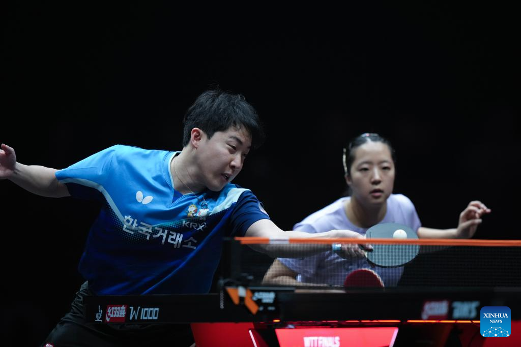 Lim Jonghoon (L)/Shin Yubin of South Korea compete during the mixed doubles quarterfianl match between Lin Shidong/Kuai Man of China and Lim Jonghoon/Shin Yubin of South Korea at the WTT Finals Hong Kong 2025 in Hong Kong, south China, Dec. 13, 2025. (Xinhua/Lui Siu Wai)