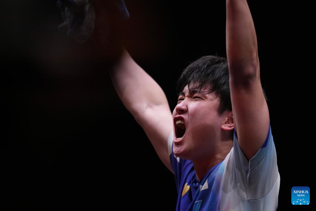 Harimoto Tomokazu celebrates after the men's singles quarterfianl match between Harimoto Tomokazu of Japan and Felix Lebrun of France at the WTT Finals Hong Kong 2025 in Hong Kong, south China, Dec. 13, 2025. (Xinhua/Lui Siu Wai)
