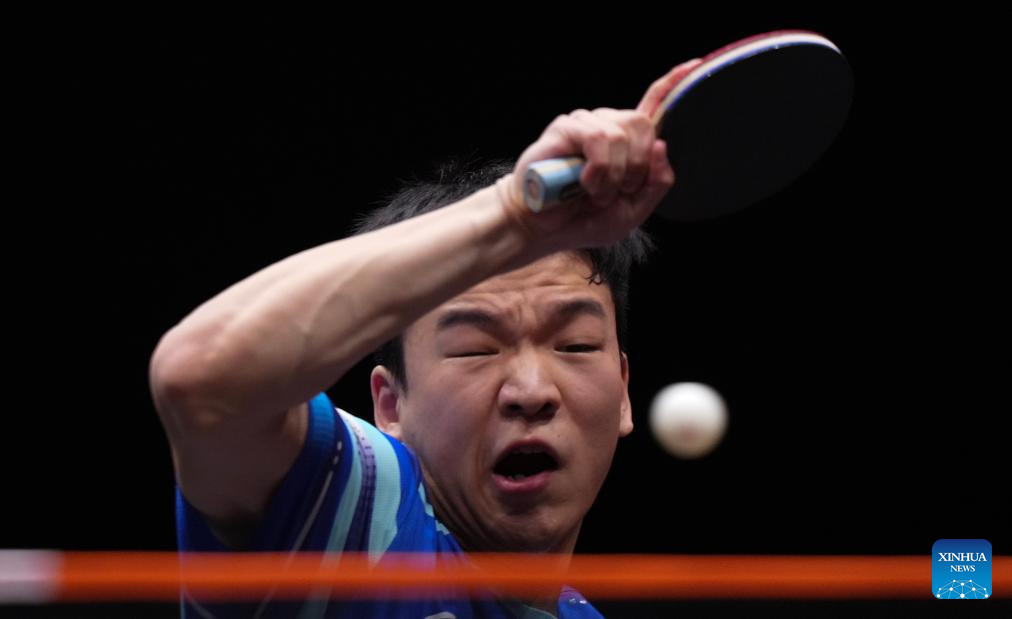 Lin Shidong competes during the men's singles quarterfianl match between Lin Shidong of China and Xiang Peng of China at the WTT Finals Hong Kong 2025 in Hong Kong, south China, Dec. 13, 2025. (Xinhua/Lui Siu Wai)