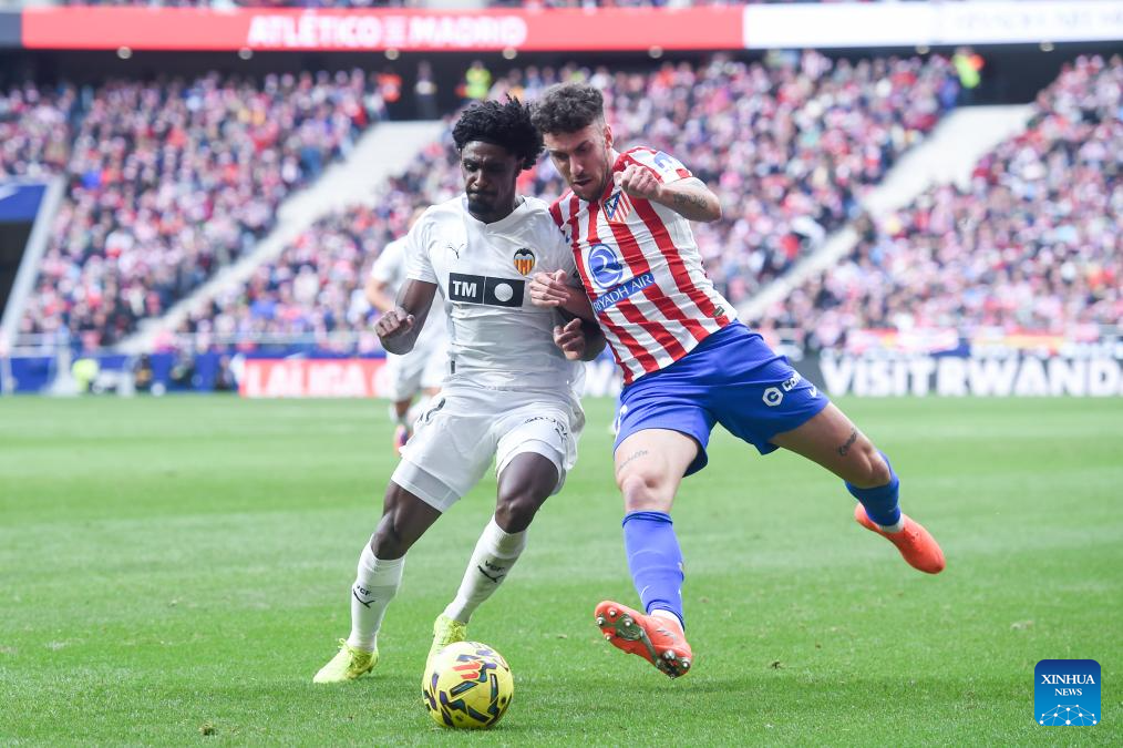 Atletico de Madrid's Matteo Ruggeri (R) vies with Valencia C.F.'s Thierry Correia during the Laliga football match between Atletico de Madrid and Valencia C.F. in Madrid, Spain, Dec. 13, 2025. (Photo by Gustavo Valiente/Xinhua)