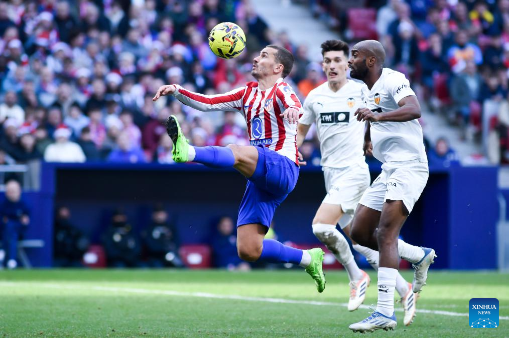 Atletico de Madrid's Antoine Griezmann (L) controls the ball during the Laliga football match between Atletico de Madrid and Valencia C.F. in Madrid, Spain, Dec. 13, 2025. (Photo by Gustavo Valiente/Xinhua)