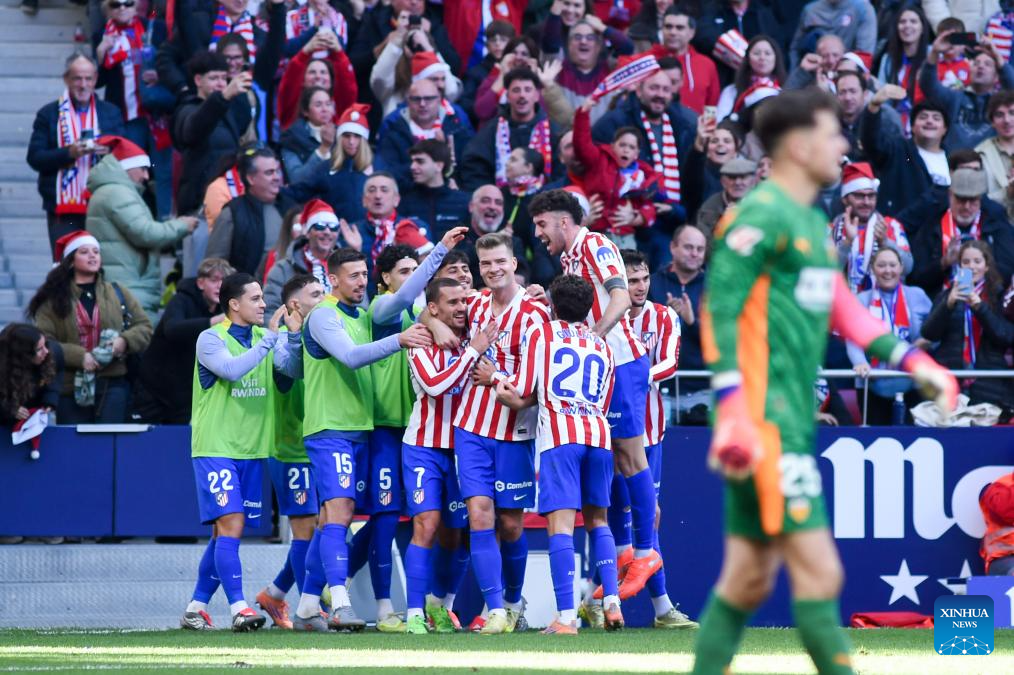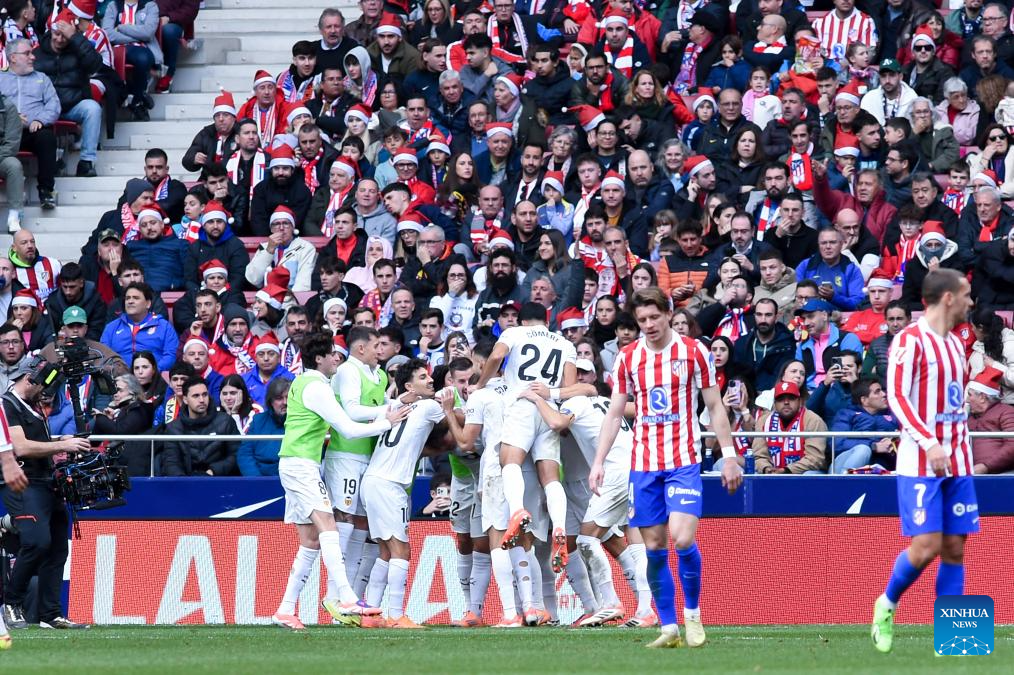 Valencia C.F.'s players celebrate a goal during the Laliga football match between Atletico de Madrid and Valencia C.F. in Madrid, Spain, Dec. 13, 2025. (Photo by Gustavo Valiente/Xinhua)