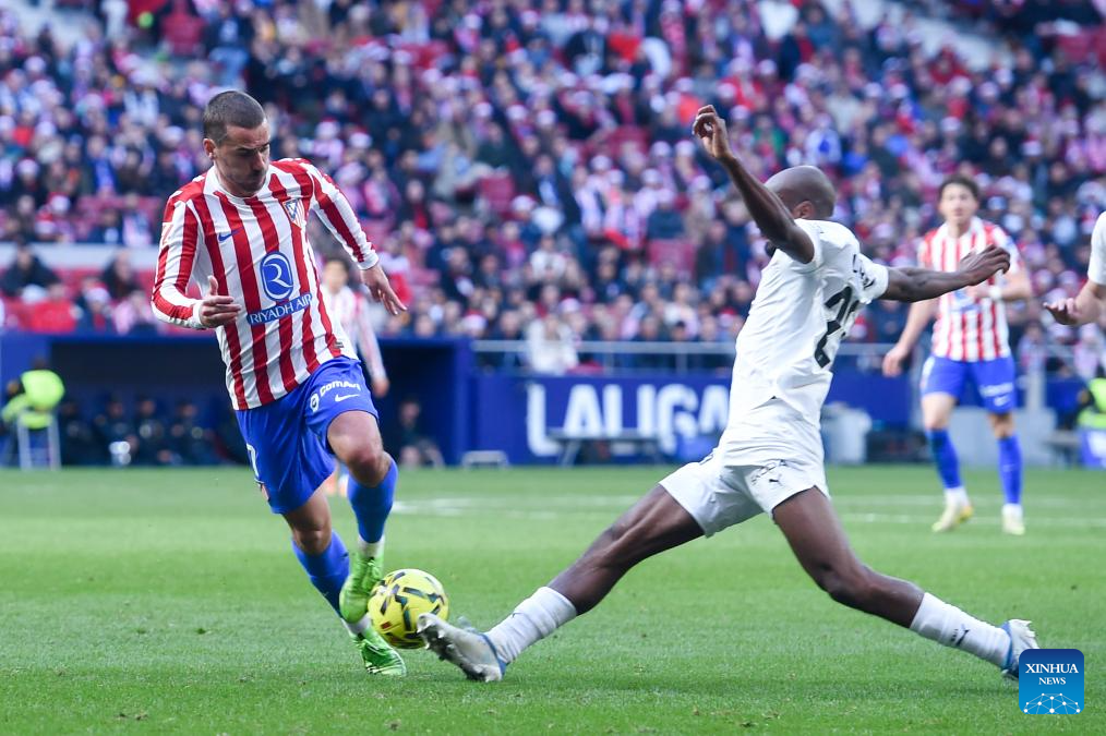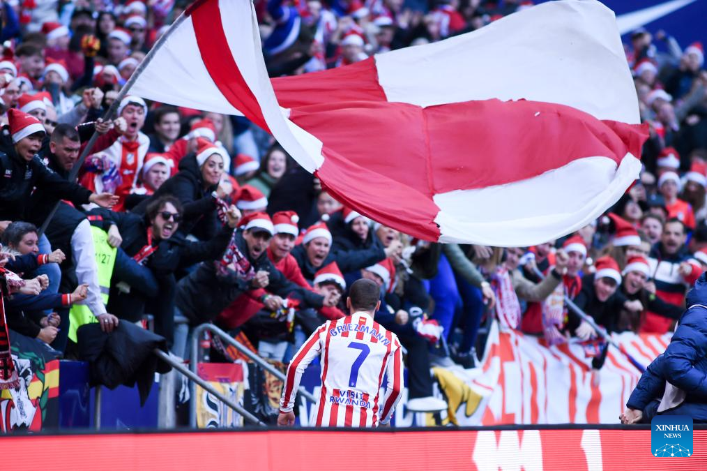 Atletico de Madrid's Antoine Griezmann celebrates after scoring during the Laliga football match between Atletico de Madrid and Valencia C.F. in Madrid, Spain, Dec. 13, 2025. (Photo by Gustavo Valiente/Xinhua)