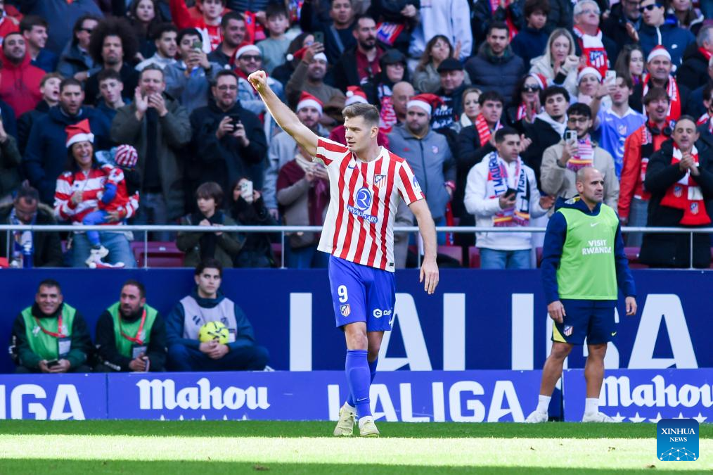 Atletico de Madrid's Alexander Sorloth (C) celebrates a goal which is later disallowed during the Laliga football match between Atletico de Madrid and Valencia C.F. in Madrid, Spain, Dec. 13, 2025. (Photo by Gustavo Valiente/Xinhua)