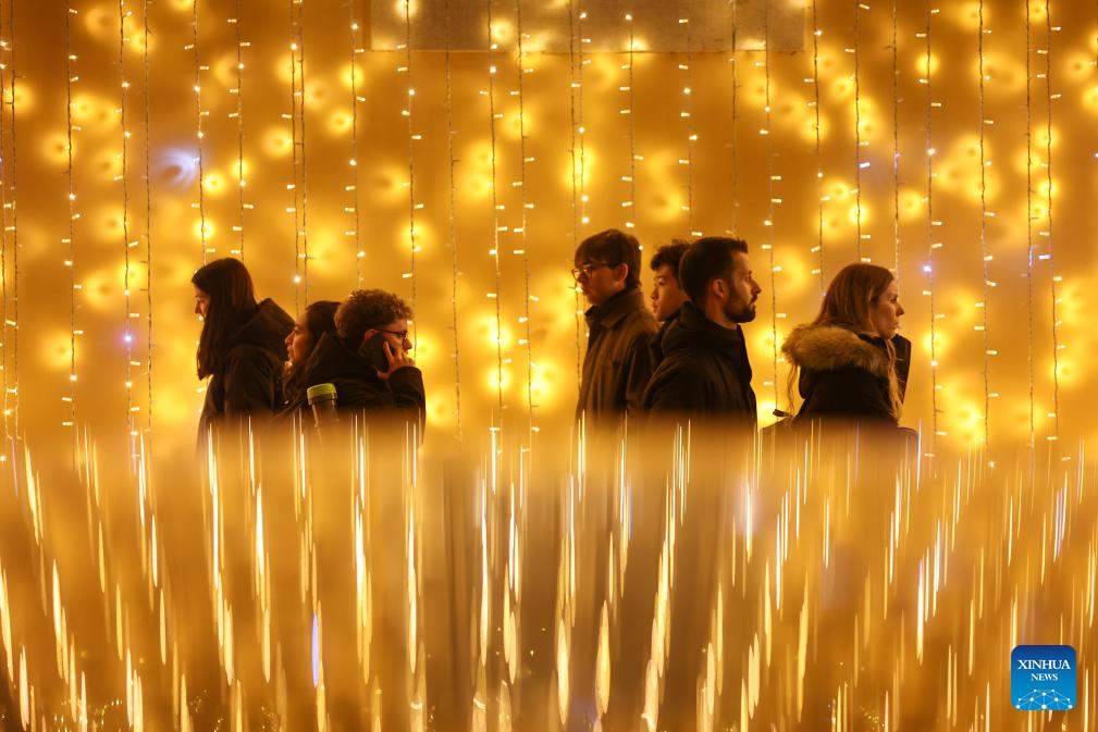 People walk past festive lights near Piazza del Popolo in Rome, Italy, Dec. 13, 2025. (Xinhua/Li Jing)