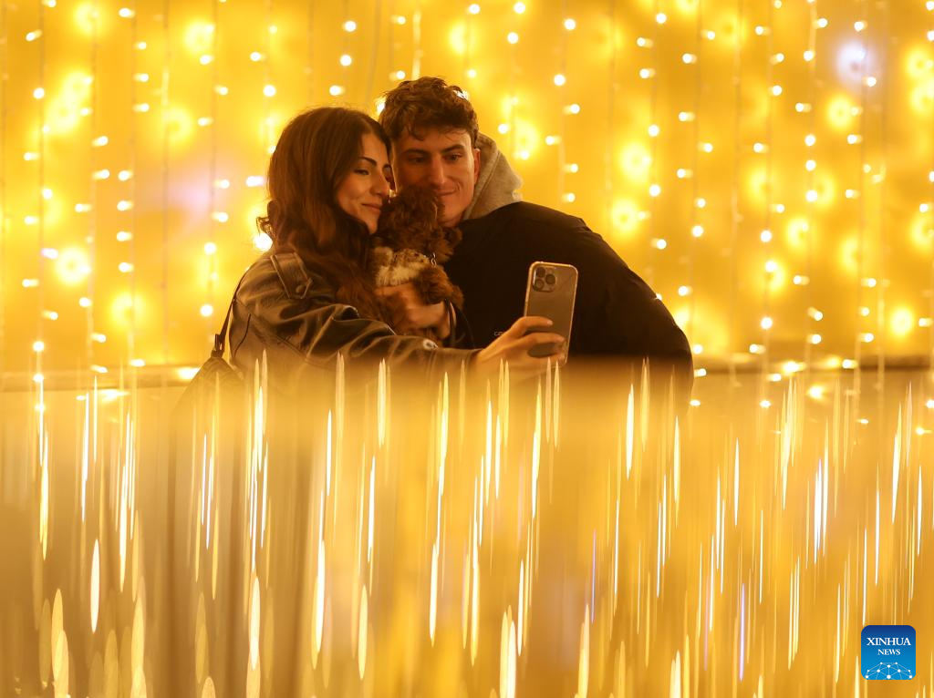 People take selfies with festive lights near Piazza del Popolo in Rome, Italy, Dec. 13, 2025. (Xinhua/Li Jing)