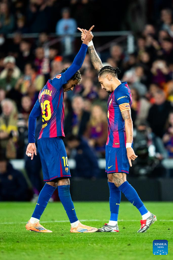 FC Barcelona's Raphinha (R) celebrates his score with teammate Lamine Yamal during the Laliga football match between FC Barcelona and CA Osasuna in Barcelona, Spain, on Dec. 13, 2025. (Photo by Joan Gosa/Xinhua)