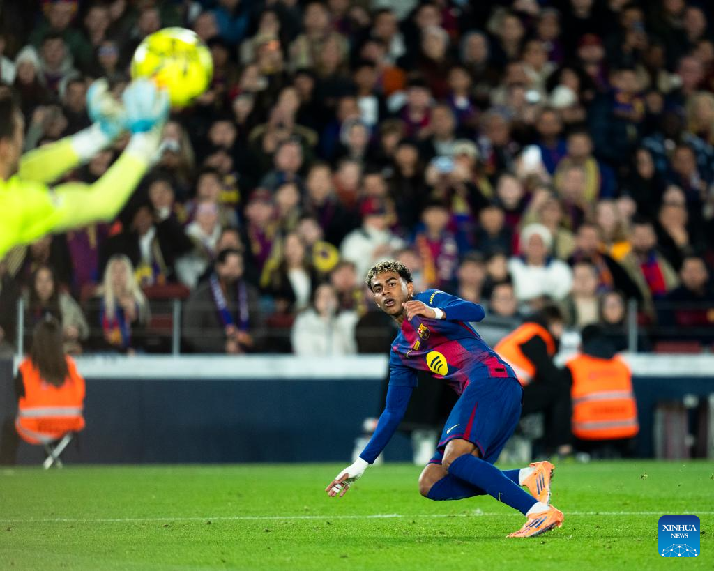 FC Barcelona's Lamine Yamal (2nd L) reacts after scoring chance during the Laliga football match between FC Barcelona and CA Osasuna in Barcelona, Spain, on Dec. 13, 2025. (Photo by Joan Gosa/Xinhua)