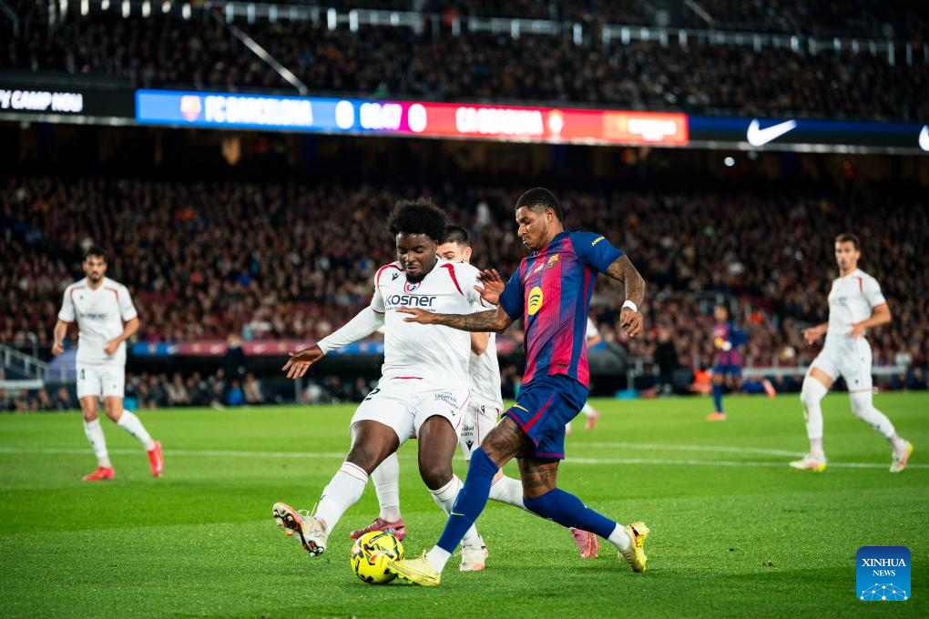 FC Barcelona's Marcus Rashford (front R) vies with CA Osasuna's Enzo Boyomo (front L) during the Laliga football match between FC Barcelona and CA Osasuna in Barcelona, Spain, on Dec. 13, 2025. (Photo by Joan Gosa/Xinhua)