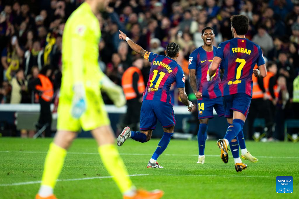 FC Barcelona's Raphinha (2nd L) scores a goal during the Laliga football match between FC Barcelona and CA Osasuna in Barcelona, Spain, on Dec. 13, 2025. (Photo by Joan Gosa/Xinhua)