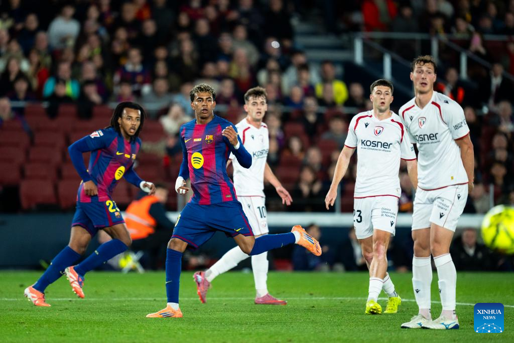 FC Barcelona's Lamine Yamal (1st L) vies with CA Osasuna's Abel Bretones (2nd R) during the Laliga football match between FC Barcelona and CA Osasuna in Barcelona, Spain, on Dec. 13, 2025. (Photo by Joan Gosa/Xinhua)