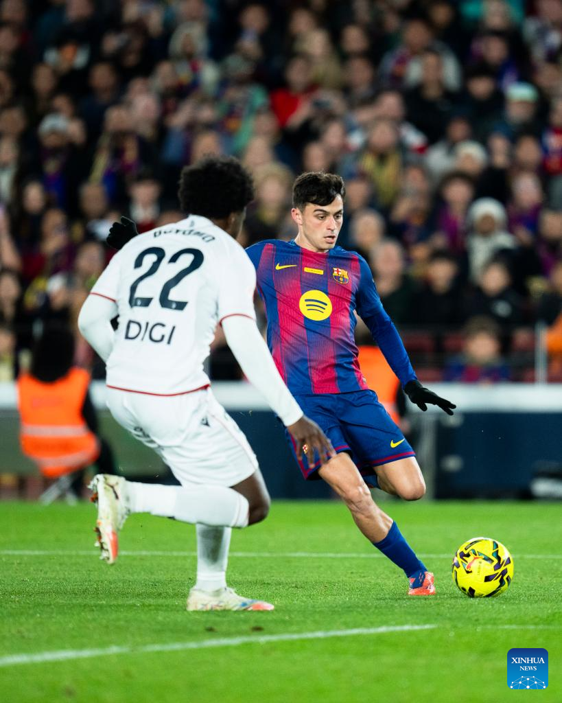FC Barcelona's Pedri vies with CA Osasuna's Ruben Garcia during the Laliga football match between FC Barcelona and CA Osasuna in Barcelona, Spain, on Dec. 13, 2025. (Photo by Joan Gosa/Xinhua)