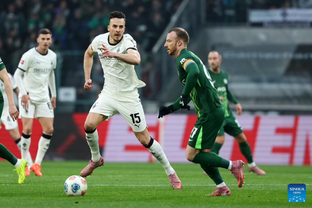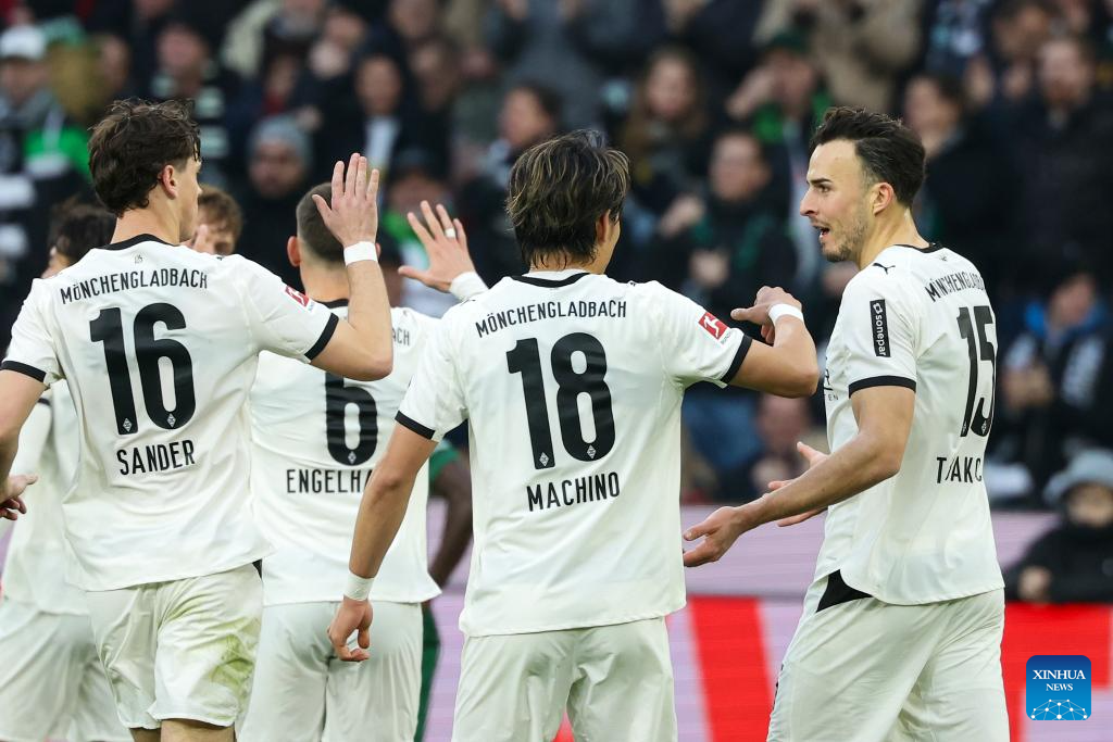 Players of Borussia Moenchengladbach celebrate scoring during the German first division of Bundesliga football match between Borussia Moenchengladbach and VfL Wolfsburg in Moenchengladbach, Germany, Dec. 13, 2025. (Photo by Joachim Bywaletz/Xinhua)