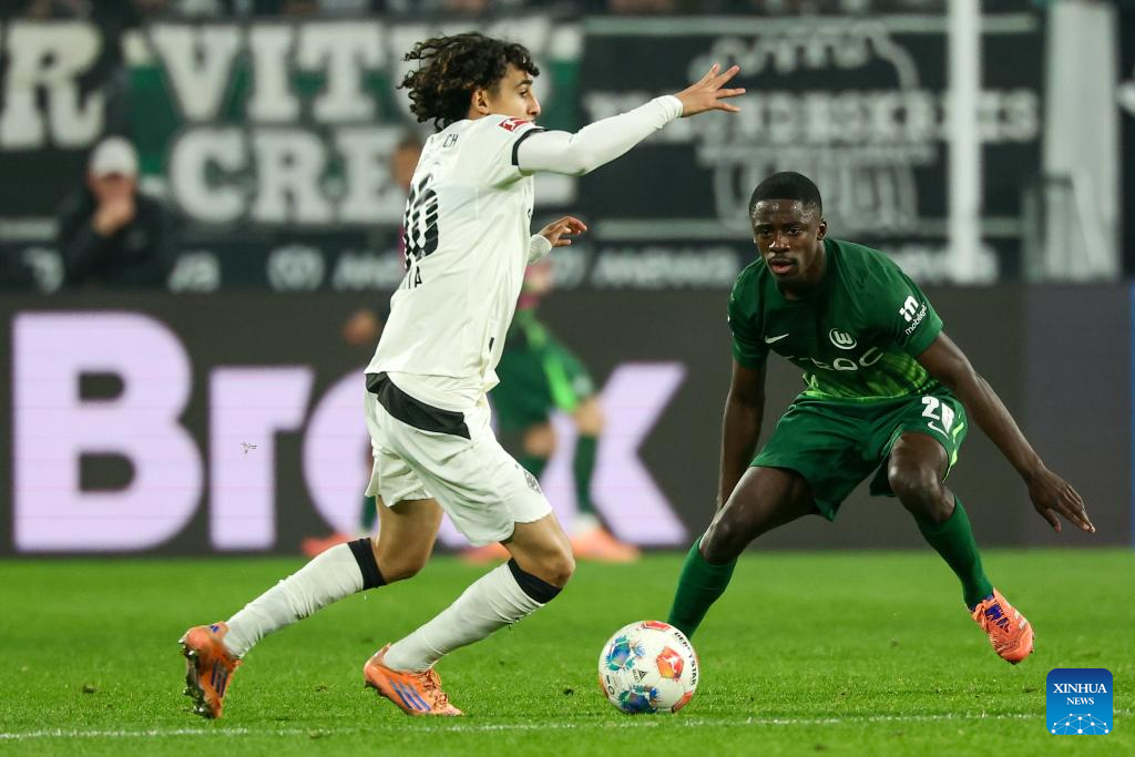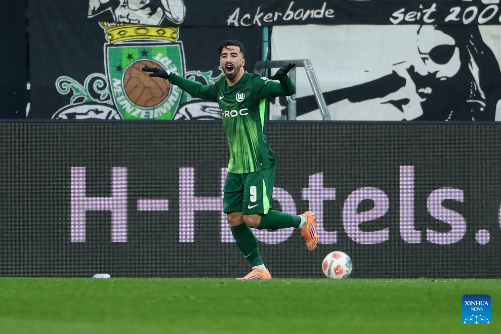 Mohammed Amoura of VfL Wolfsburg celebrates scoring during the German first division of Bundesliga football match between Borussia Moenchengladbach and VfL Wolfsburg in Moenchengladbach, Germany, Dec. 13, 2025. (Photo by Joachim Bywaletz/Xinhua)