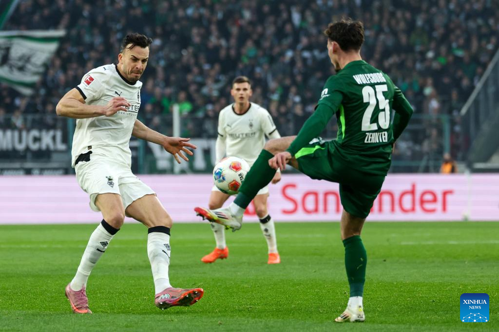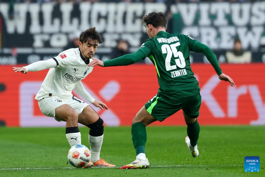 Wael Mohya (L) of Borussia Moenchengladbach vies with Sael Kumbedi of VfL Wolfsburg during the German first division of Bundesliga football match between Borussia Moenchengladbach and VfL Wolfsburg in Moenchengladbach, Germany, Dec. 13, 2025. (Photo by Joachim Bywaletz/Xinhua)