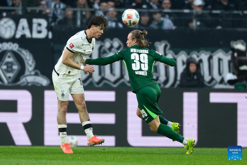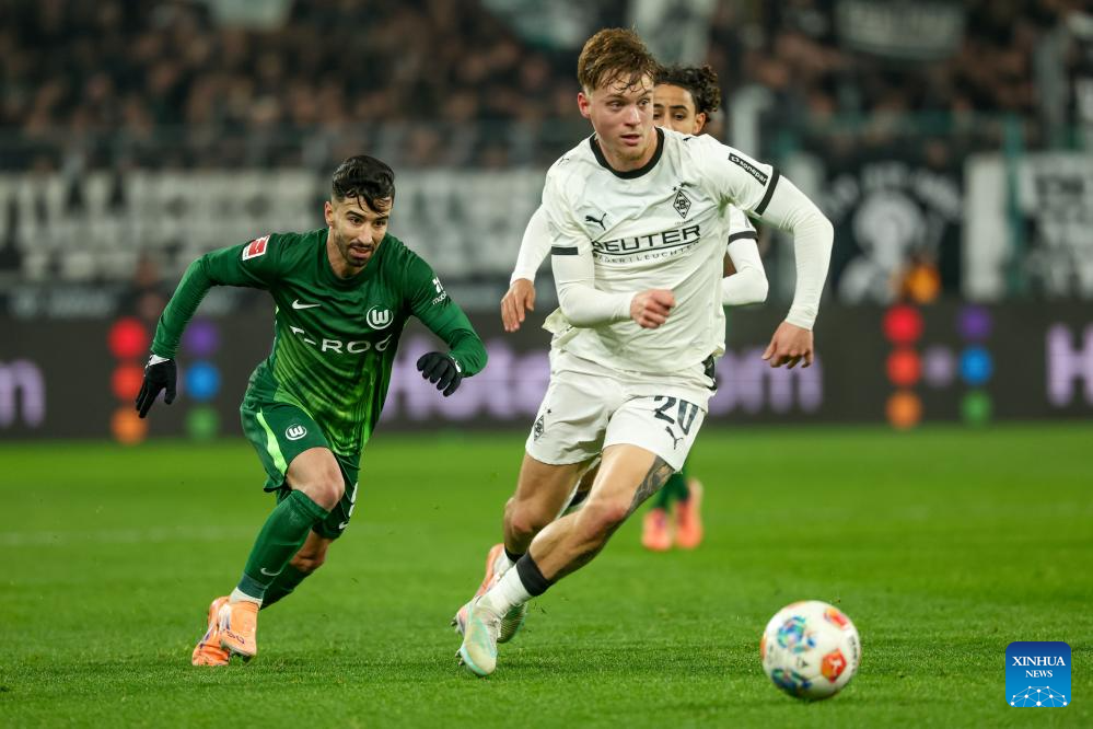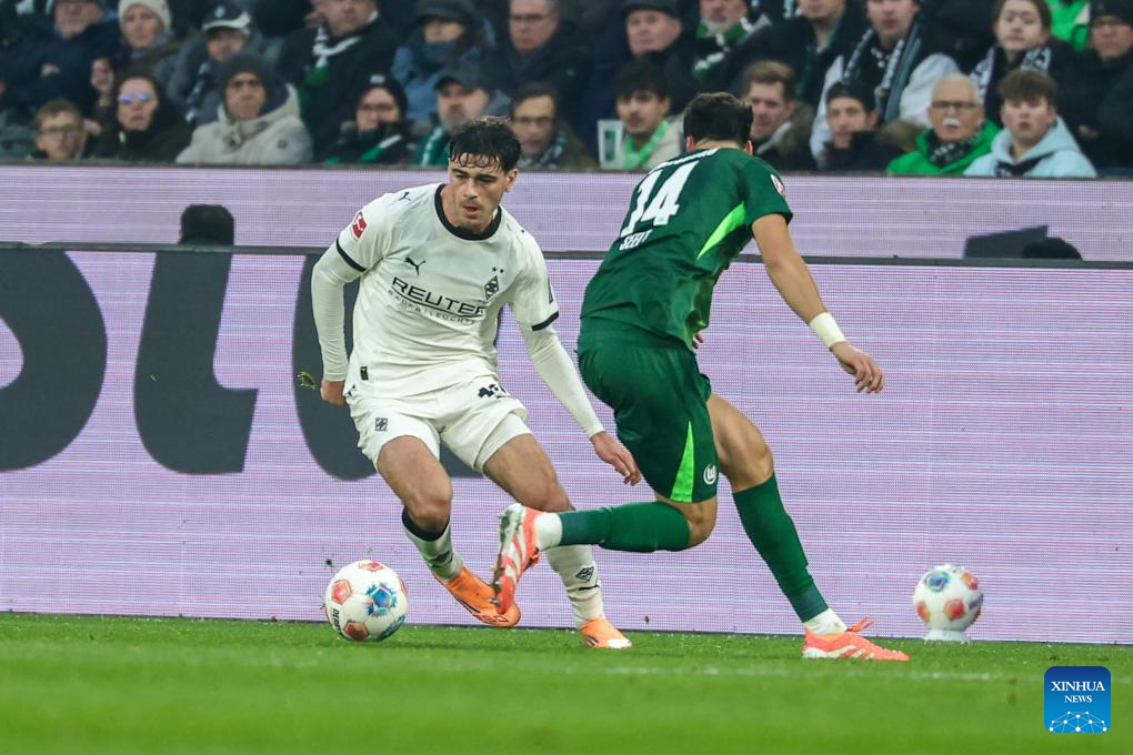 Luca Netz (R) of Borussia Moenchengladbach vies with Mohammed Amoura of VfL Wolfsburg during the German first division of Bundesliga football match between Borussia Moenchengladbach and VfL Wolfsburg in Moenchengladbach, Germany, Dec. 13, 2025. (Photo by Joachim Bywaletz/Xinhua)